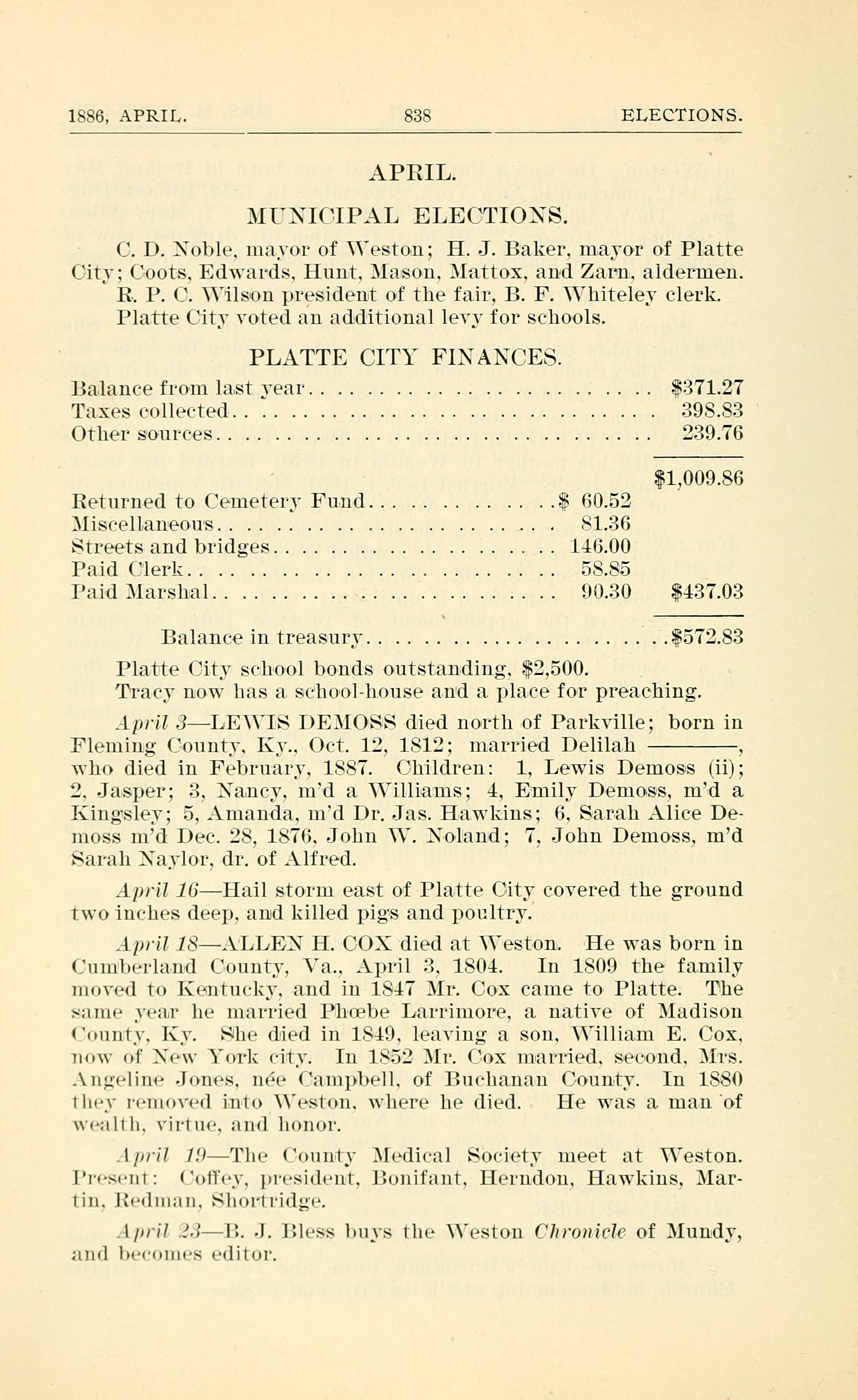 April 18 - ALLEN H. COX died at Weston. He was born in Cumberland County, Va., April 3, 1804. In 1809 the family moved to Kentucky and in 1817 Mr. Cox came to Platte. The same year he married Phoebe Larrimore, a native of Madison County, Ky. She died in 1849, leaving a son, William E. Cox, now of New York City. In 1852 Mr. Cox married, second, Mrs. Angeline Jones nee Campbell, of Buchanan County. In 1880 they removed into Weston, where he died. He was a man of wealth, virtue, and honor.