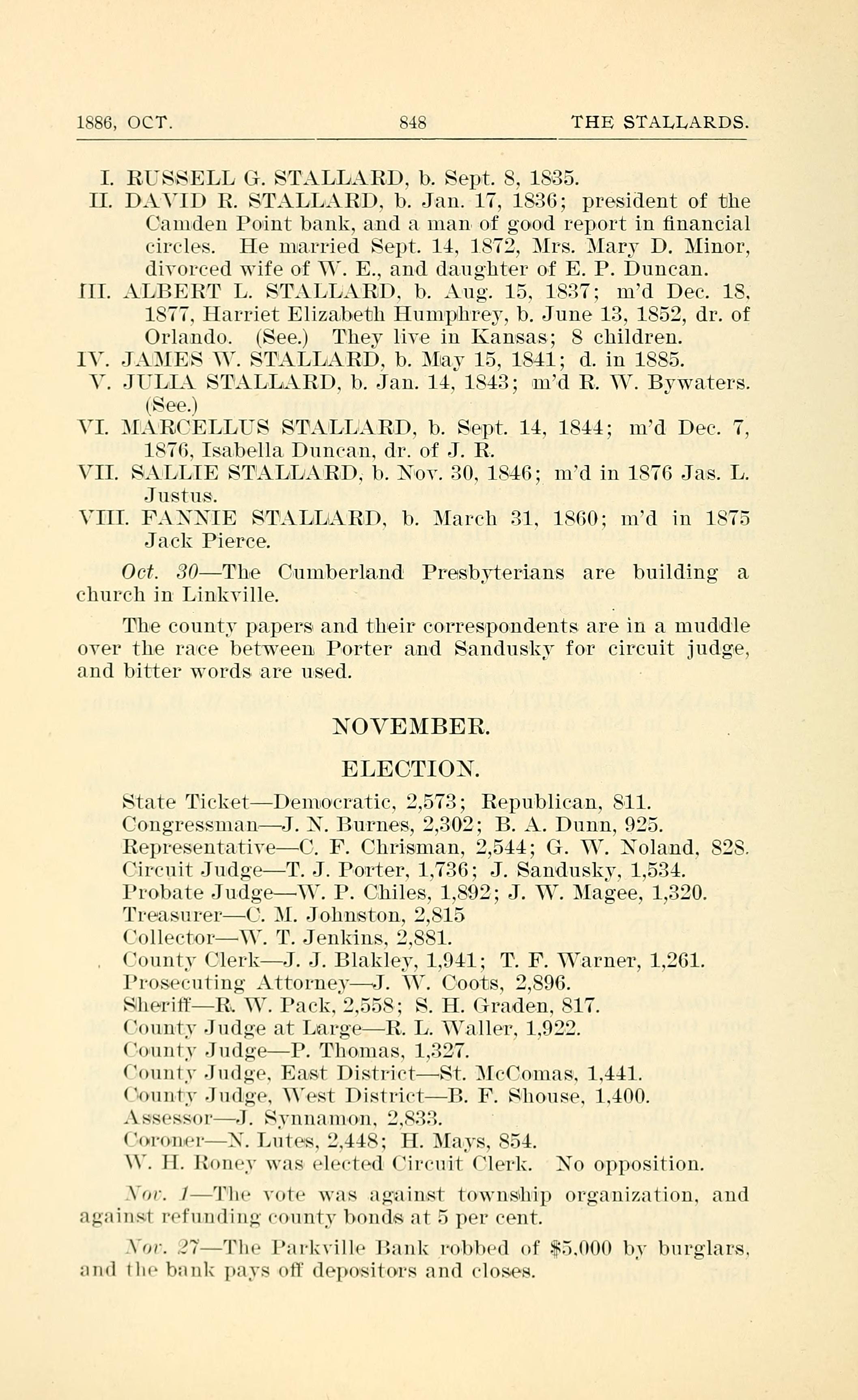VI. MARCELLUS STALLARD. b. Sept. 14, 1844; md Dec. 7, 1876. Isabella Duncan, dr. of J. R.