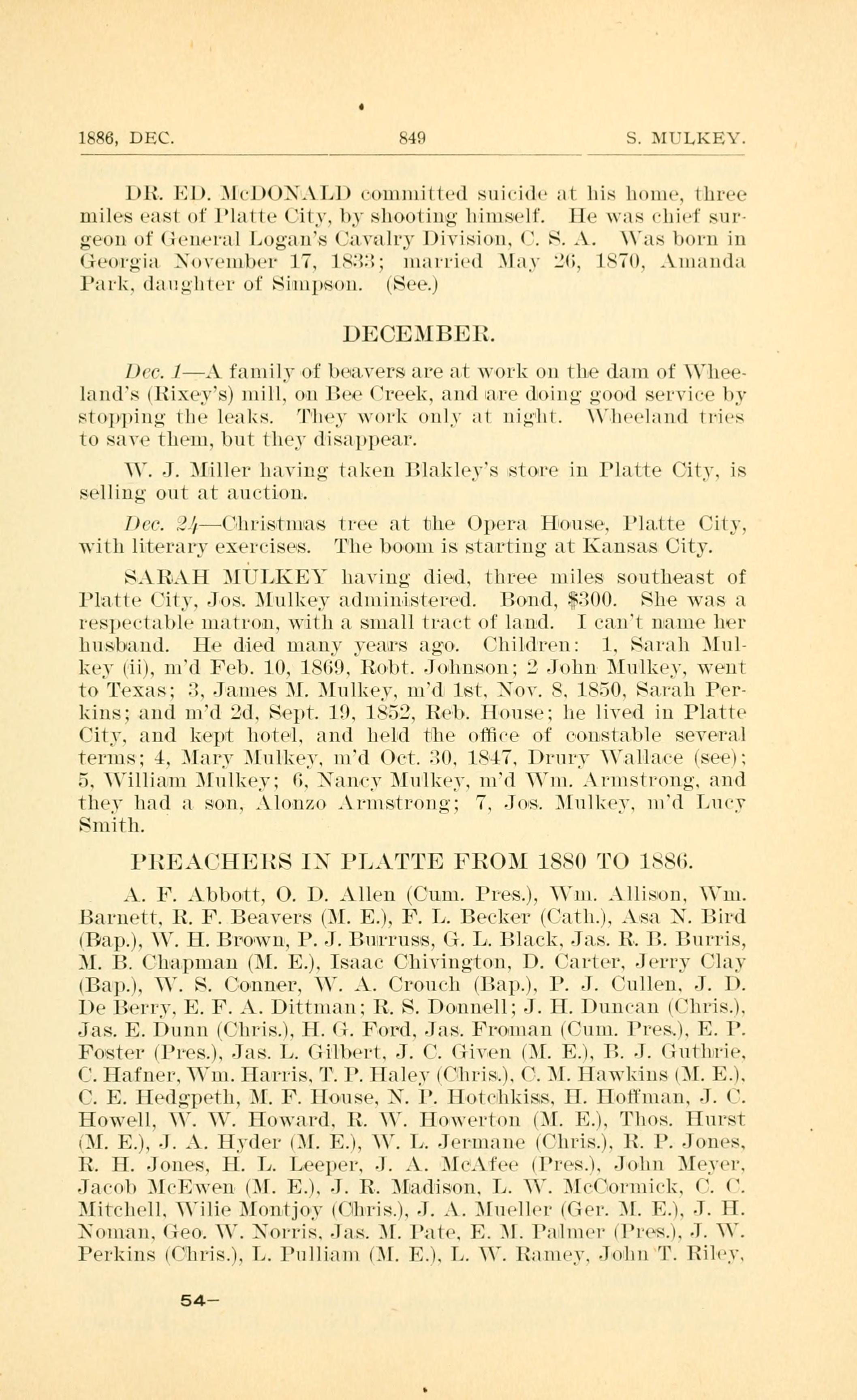 Dr. ED McDONALD committed suicide at his home, three miles east of Platte City, by shooting himself. He was chief surgeon of General Logan's Cavalry Division, C. S. A. Was born in Georgia, November 17, 1833; married May 26, 1870, Amanda Park, daughter of Simpson. (See.)