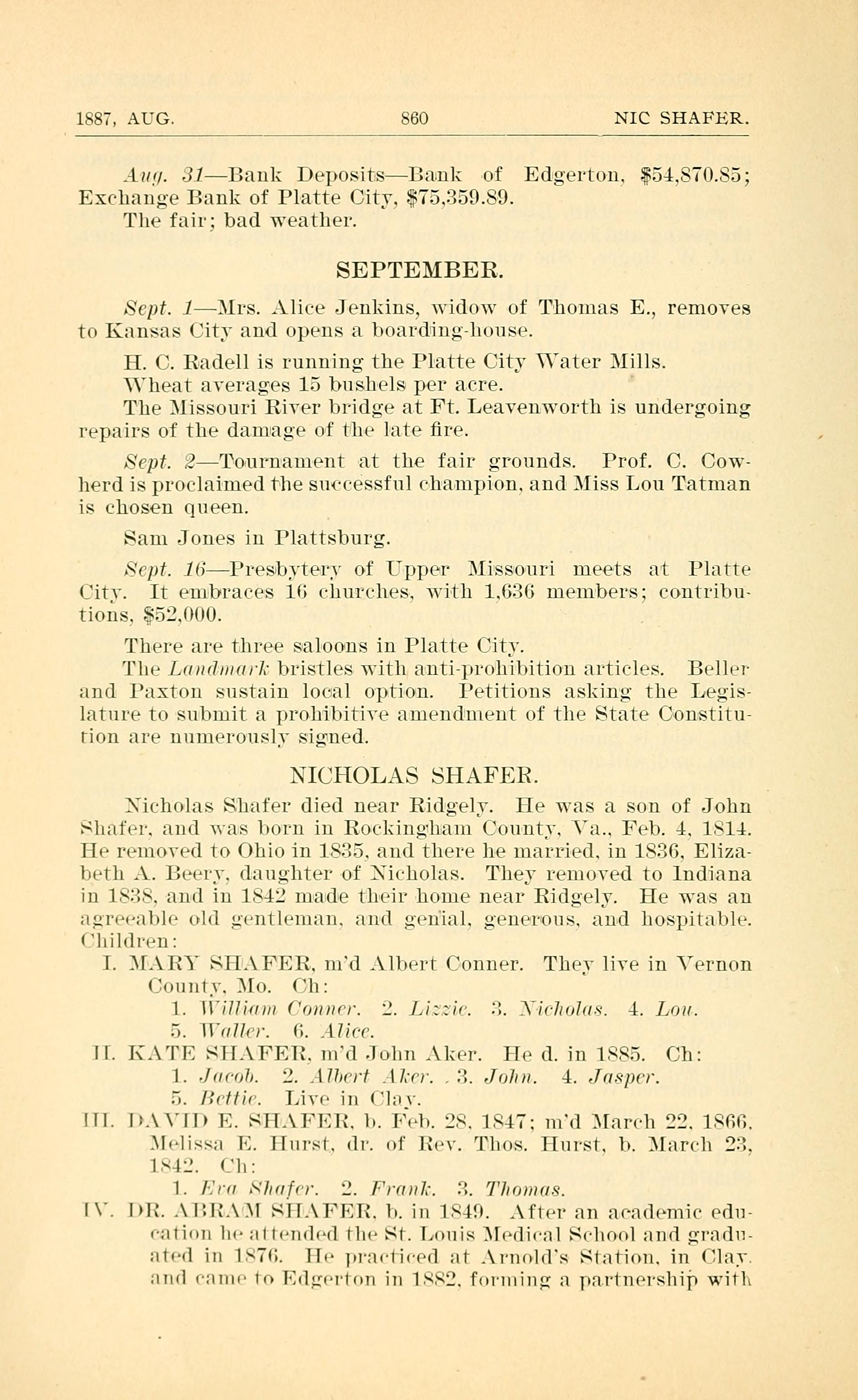 IV. DR. ABRAM SHAFER, b. in 1849. Afer an academic education he attended the St. Louis Medical School and graduated in 1876. He practiced at Arnold's Station, in Clay and came to Edgerton in 1882, forming a partnership with