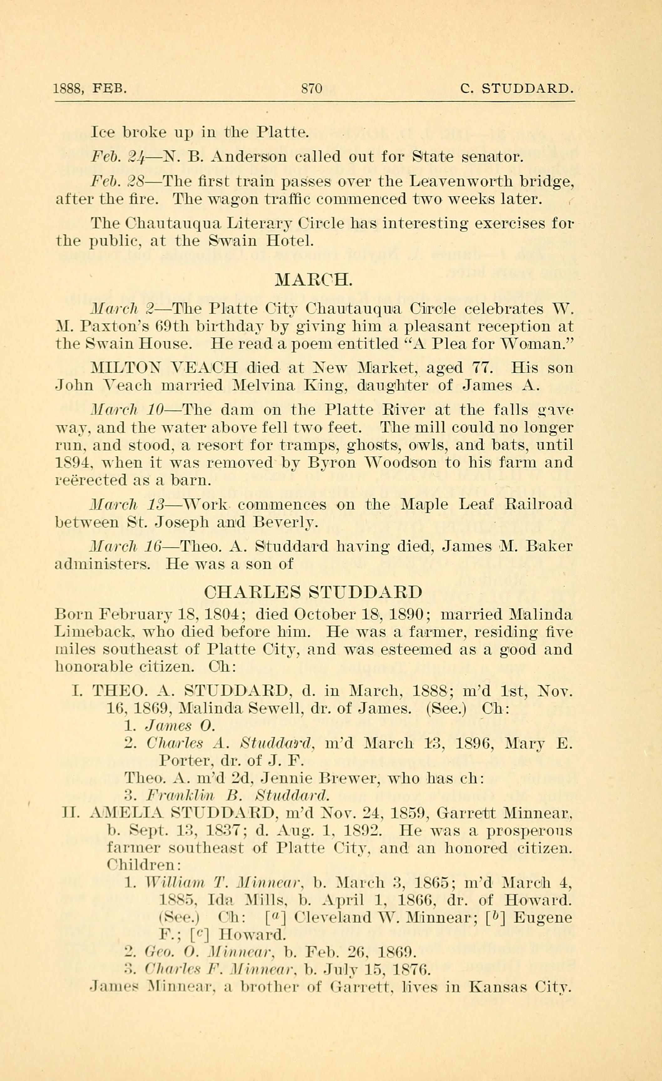 II. AMELIA STUDDARD, married Nov. 24, 1859, Garrett Minnear, b. Sept. 13, 1837; d. Aug. 1, 1892. He was a prosperous farmer southeast of Platte City, and an honored citizen. Children: