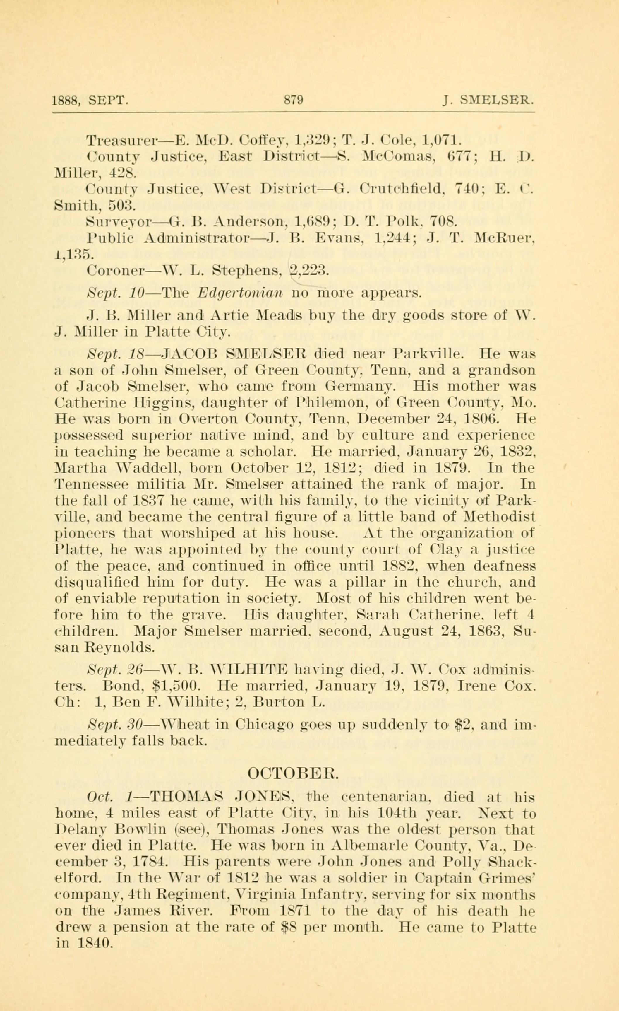 Oct. 1 - THOMAS JONES, the centenarian, died at his home, 4 miles east of Platte City, in his 104th year. Next to Delany Bowlin (see), Thomas Jones was the oldest person that ever died in Platte. He was born in Albermarle County, Va., December 3, 1784. His parents were John Jones and Polly Shackelford. In the War of 1812 he was a soldier in Captain Grimes' company, 4th Regiment, Virginia Infantry, serving for six months on the James River. From 1871 to the day of his death he drew a pension at the rate of $8 per month. He came to Platte in 1840.