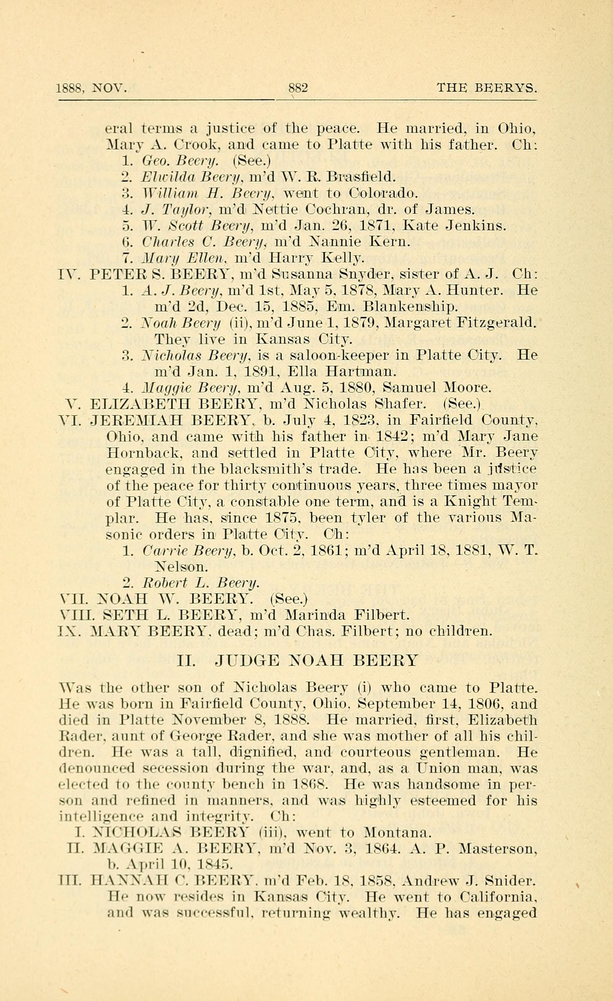 2. Noah Beery (ii), married June 1, 1879, Margaret Fitzgerald. They live in Kansas City.
