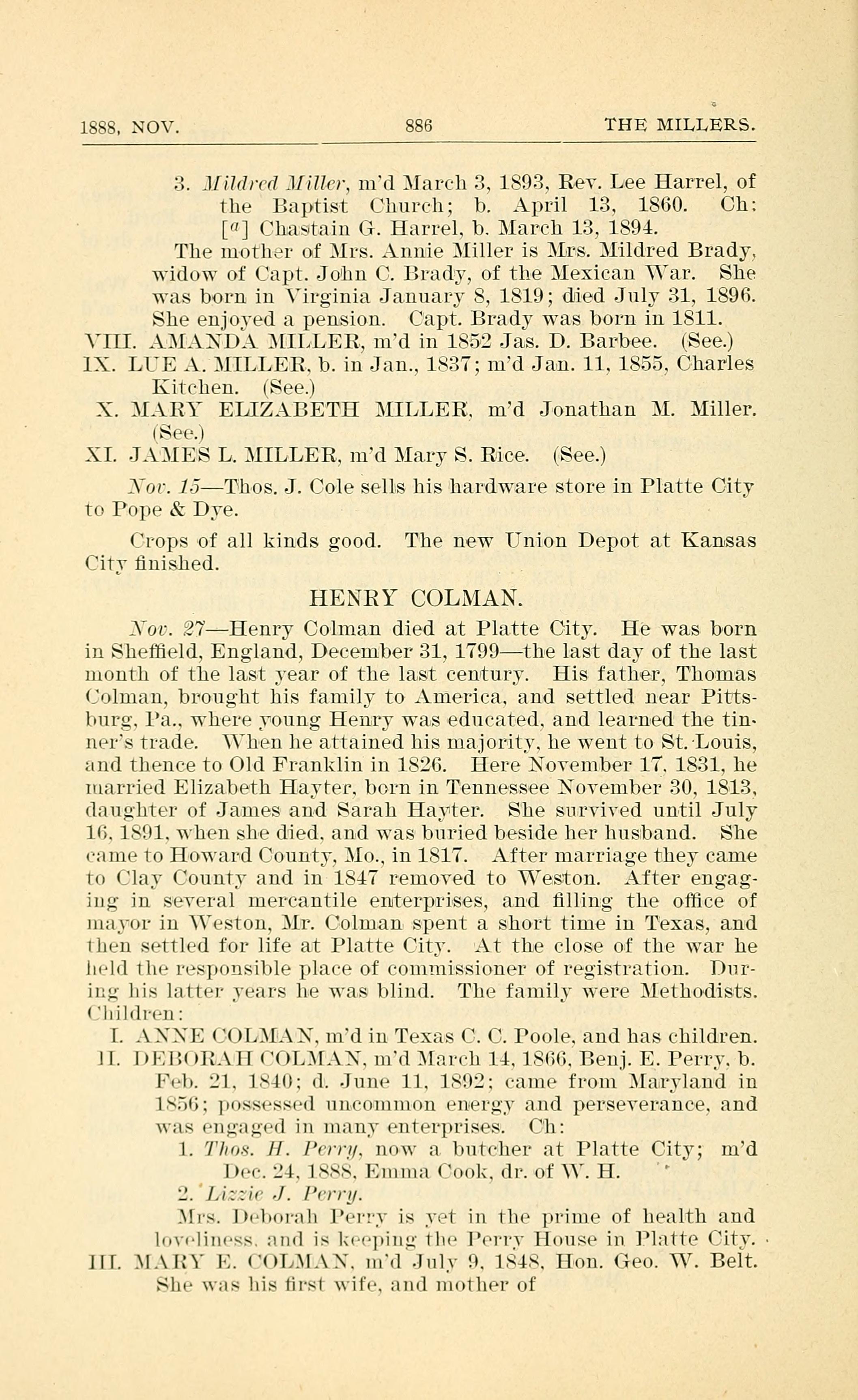 Nov. 27 - Henry Colman died at Platte City. He was born