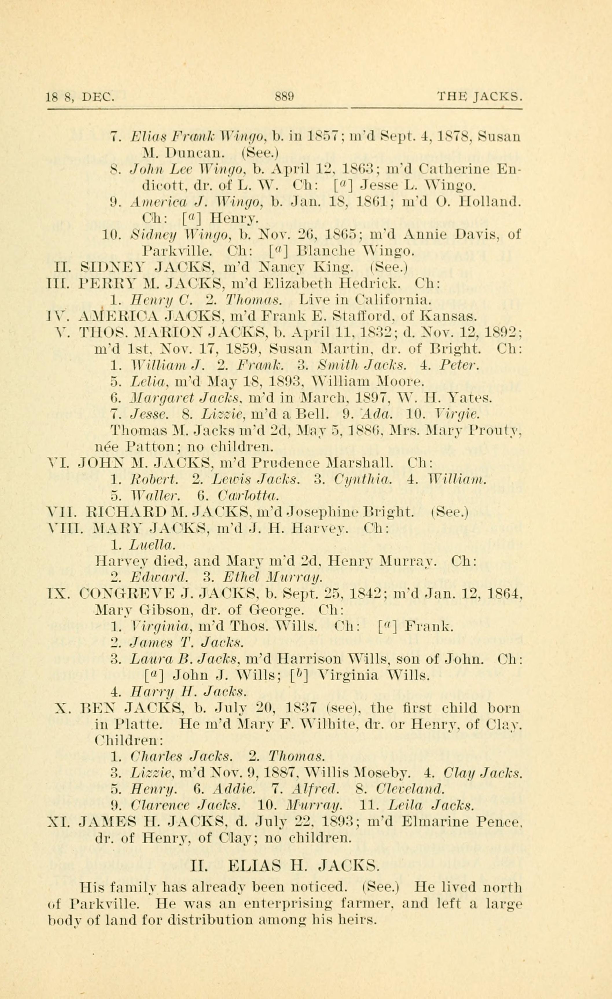 XI. JAMES H. JACKS, married Elmarine Pence, dr. of Henry Pence of Clay, no children.