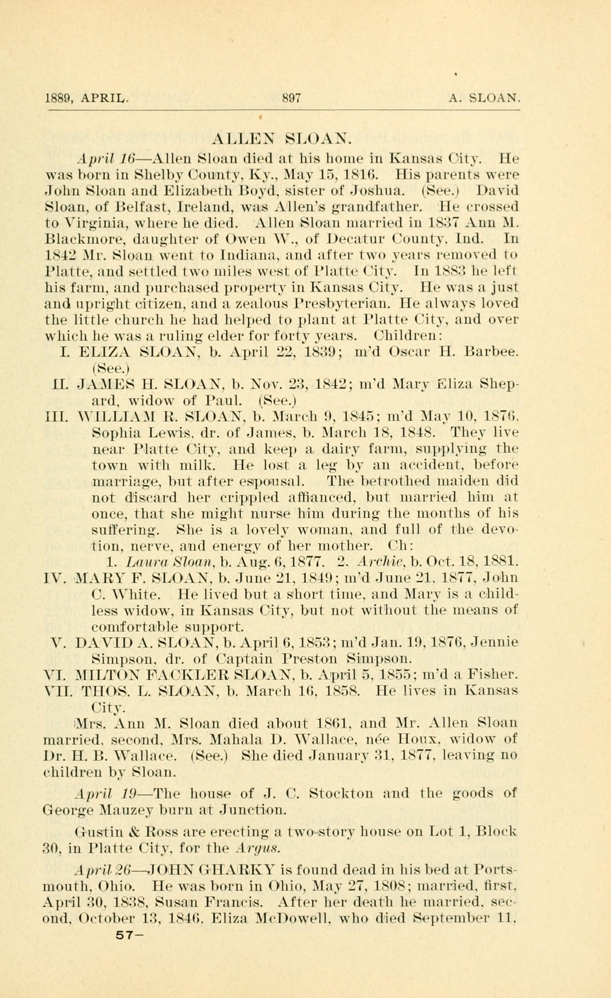 Mrs. Ann M. Sloan died about 1861, and Mr. Allen Sloan married, second, Mrs. Mahala D. wallace, nee Houx, widow of Dr. H. B. Wallace. She died January 31, 1877, leaving no children by Sloan.