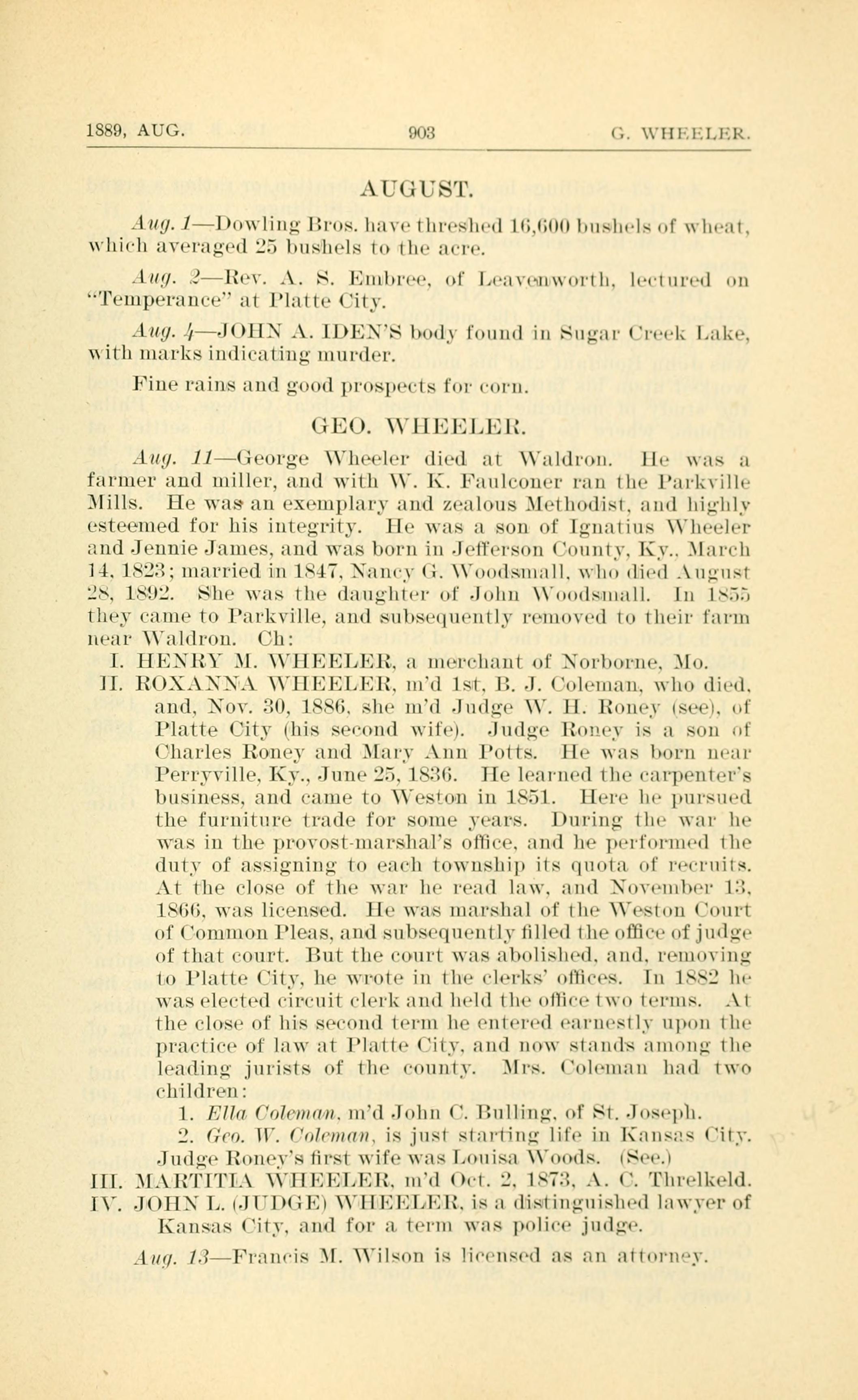 Aug. 11 - George Wheeler died at Waldron.