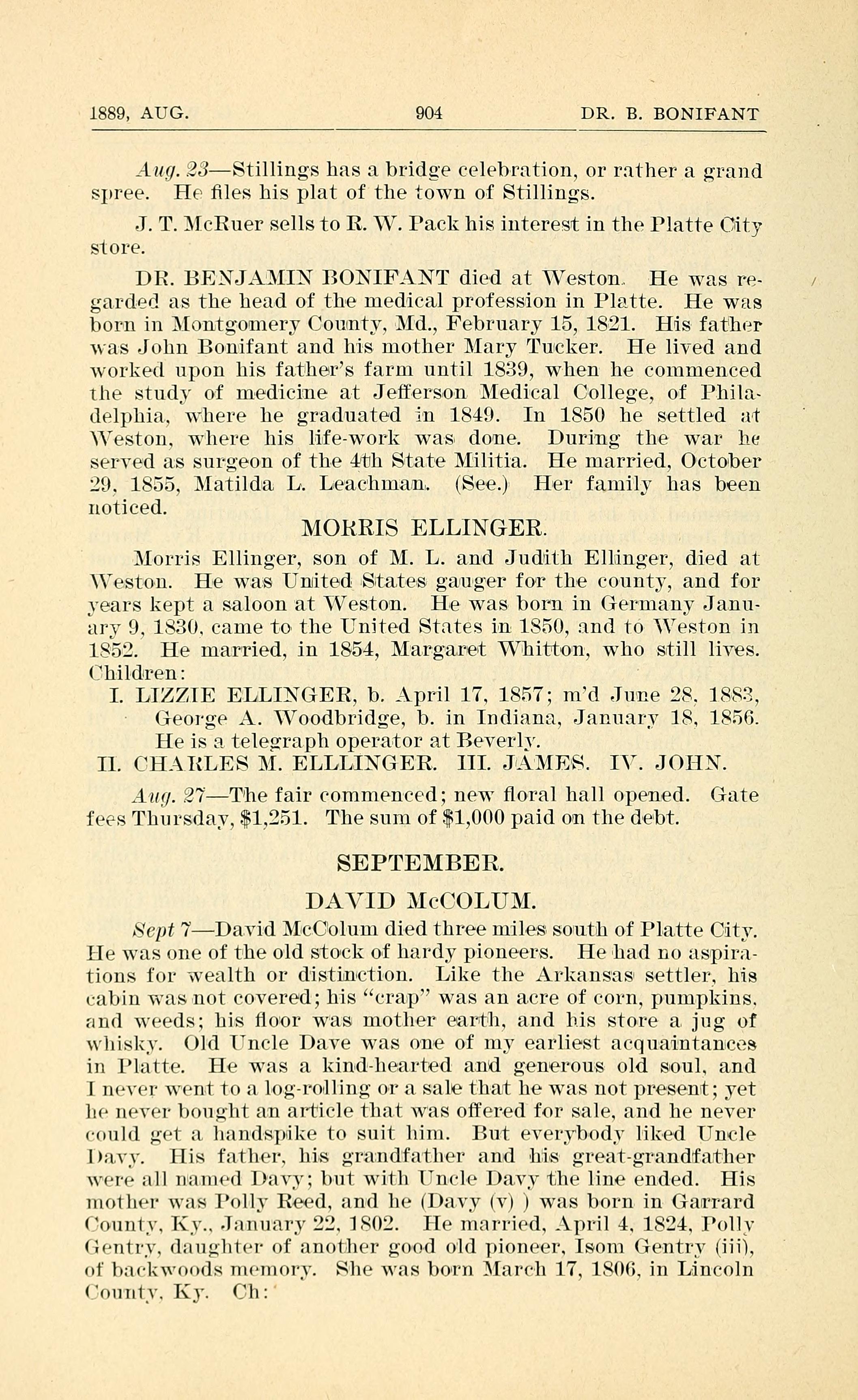 Sept 7-David McColuni died three miles sotutuh of Platte City.
