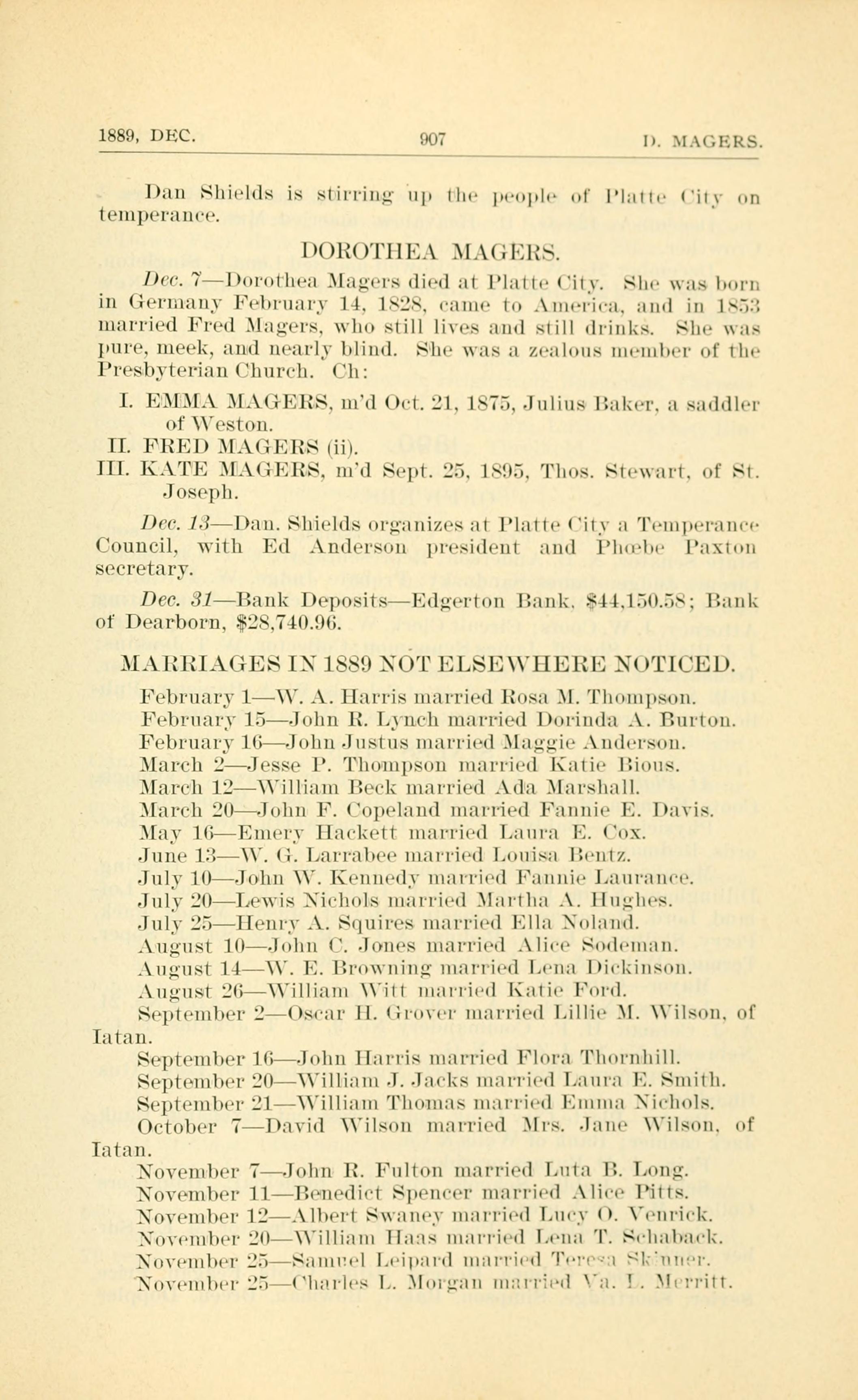 Dec. 13 - Dan Shields organizes at Platte City a Temperence Council, with Ed Anderson president and Phoebe Paxton secretary.