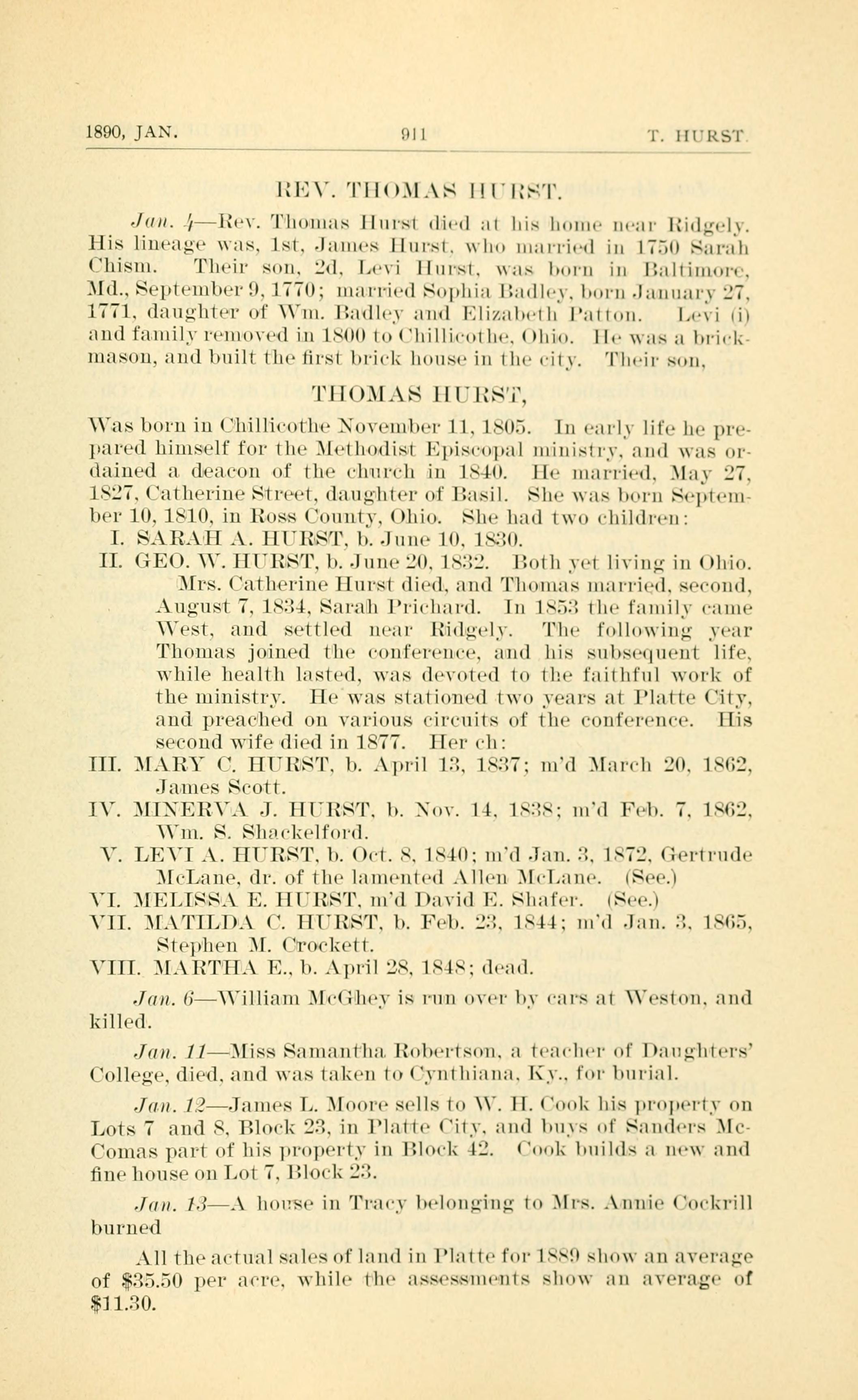 Jan. 4 - Rev. Thomas Hurst died at his home near Ridgely.
