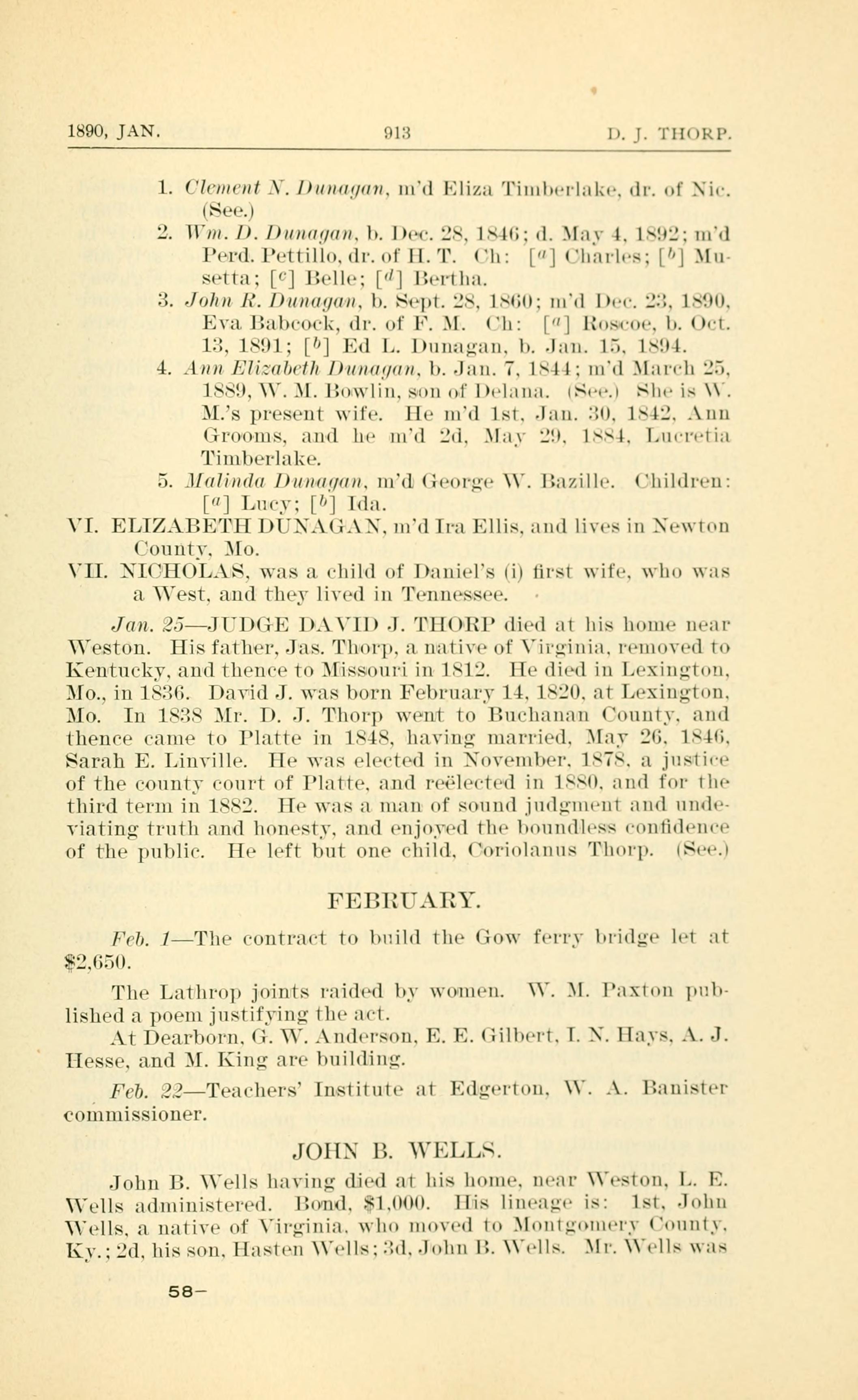 Jan. 25 - JUDGE DAVID J. THORP died at his home near Weston.