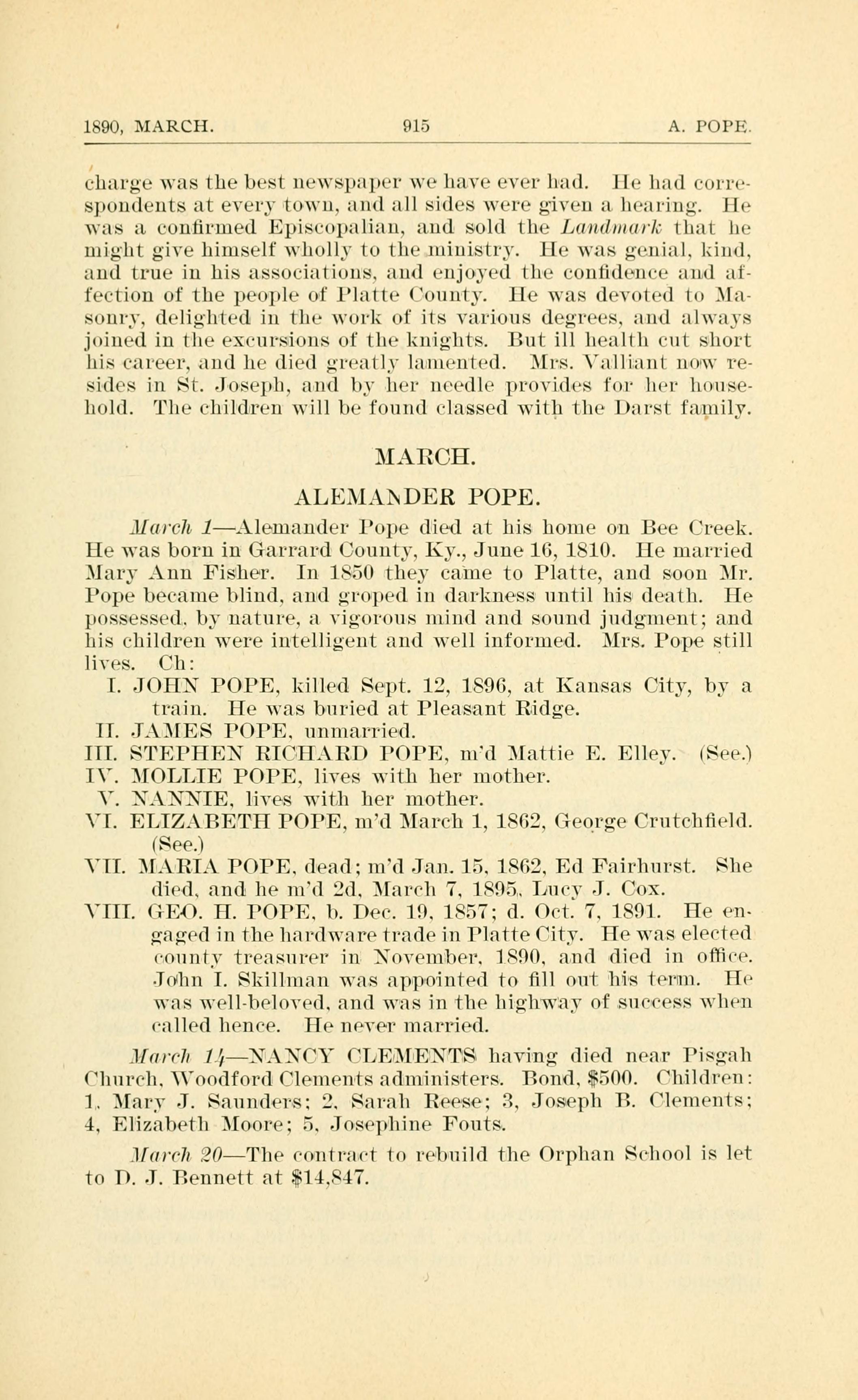 March 1Alemande1 Pope died at his home 0-n Bee (Jreek.