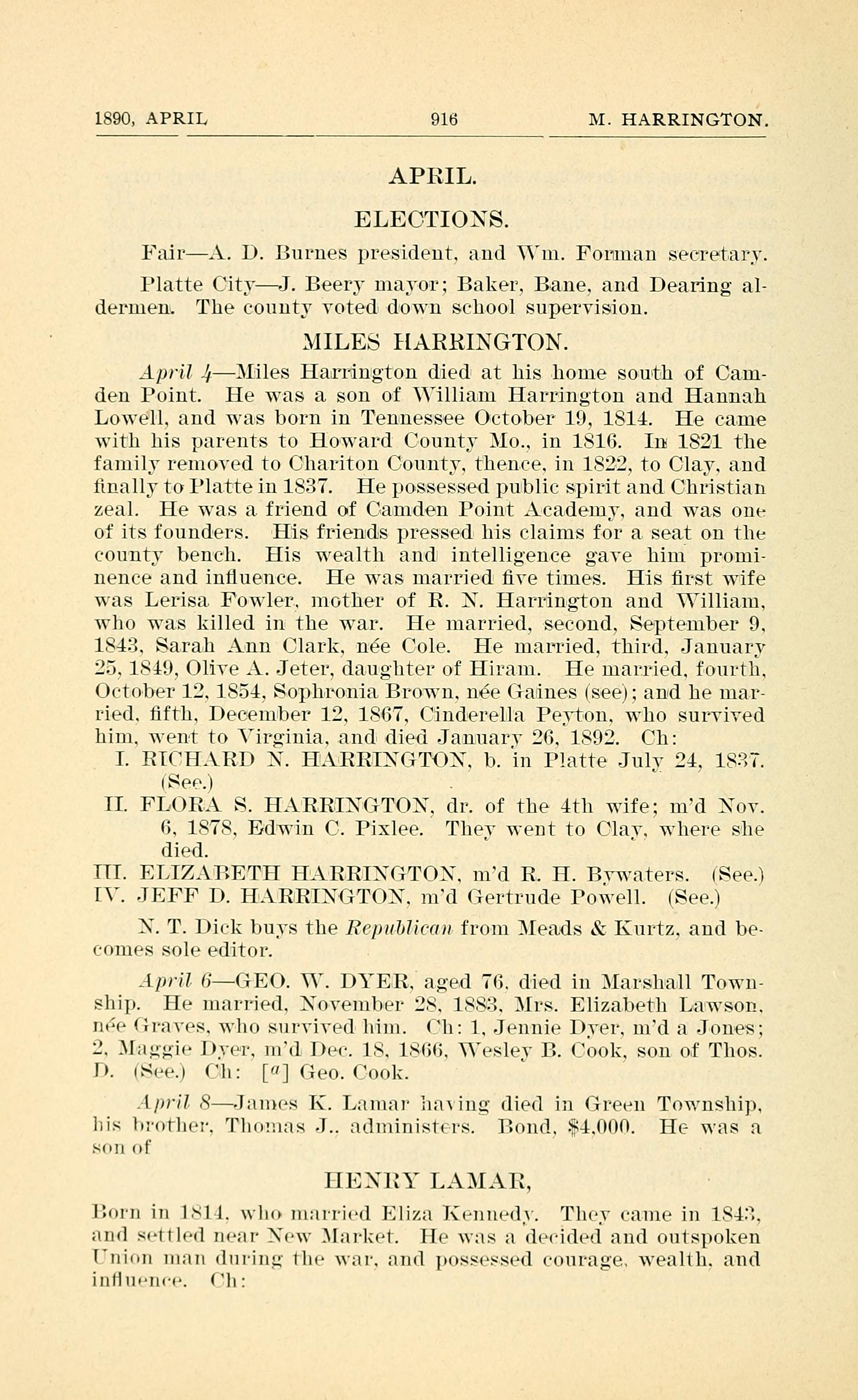 April 4 - Miles Harrington died at his home south of Camden Point. He was a son of William Harrington and Hannah Lowell. and was born in Tennessee October 19, 1814.. He came with his parents to Howard County Mo., in 1816. In 1821 the family removed to Chariton County, thence. in 1822, to Clay. and finally to Platte in 1837. He possessed public spirit and Christian zeal. He was a. friend of Camden Point Academy. and was one of its founders. His friends pressed his claims for a seat on the county bench. His wealth and intelligence gave him prominence and influence. He was married five times. His first wife was Lerisa Fowler, mother of R. N. Harrington and William, who was killed in the War. He married, second, September 9, 1843, Sarah Ann Clark. nee Cole. He married, third. January 25, 1819, Olive A. Jeter, daughter of Hiram Jeter. He married. fourth, October 12. 1854, Sophronia Brown. nee Gaines (see); and he married. fifth. December 12, 1867. Cinderella Peyton, who survived him, went to Virginia. and died January 26. 1892. Children: