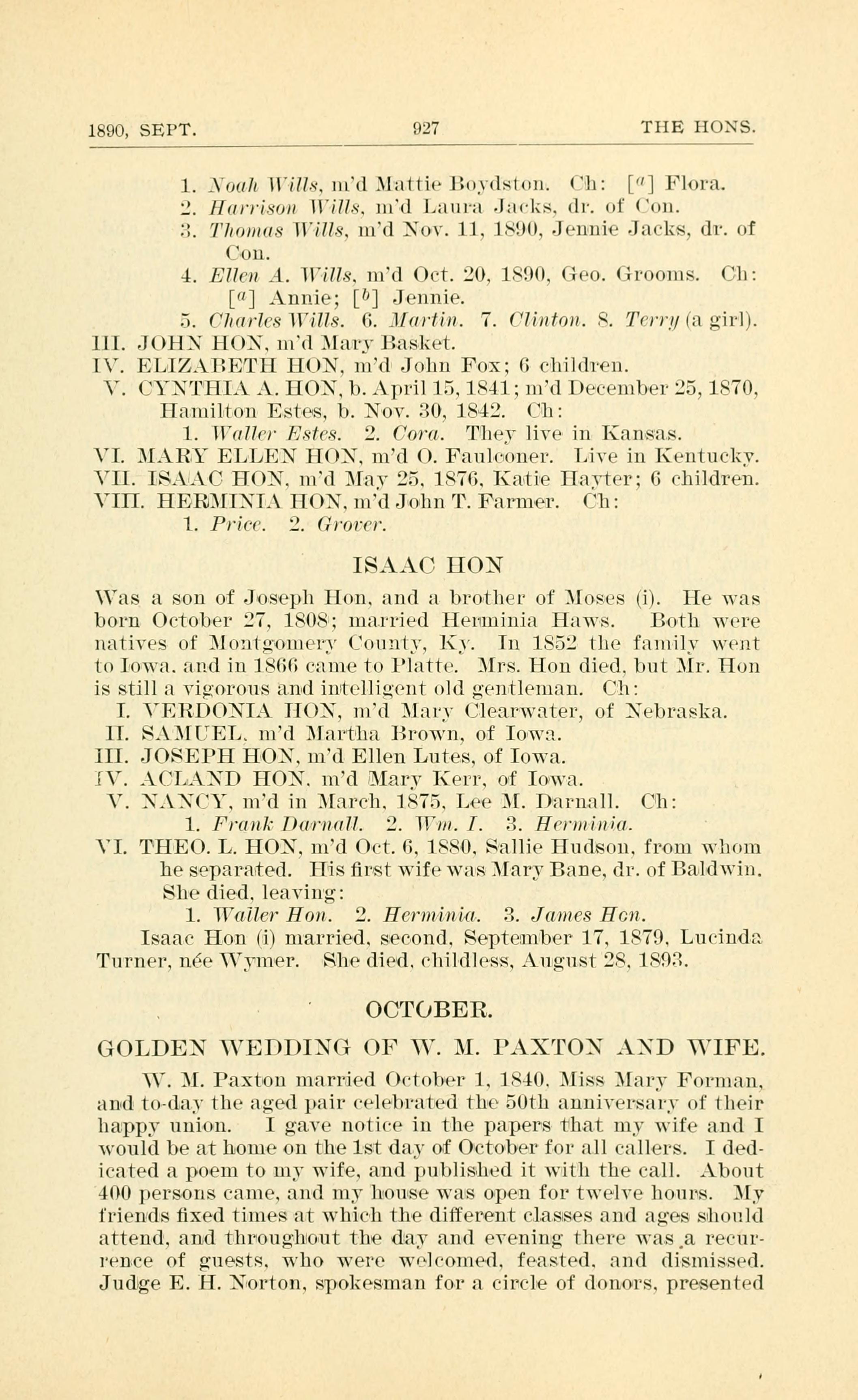Was a son of Joseph Hon, and a brother of Moses (i). He was born October 27, 1808; married Herminia Haws. Both were natives of Montgomery County, Ky. In 1852 the family went to Iowa, and in 1866 came to Platte. Mrs. Hon died, but Mr. Hon is still a vigorous and intelligent old gentleman. Children: