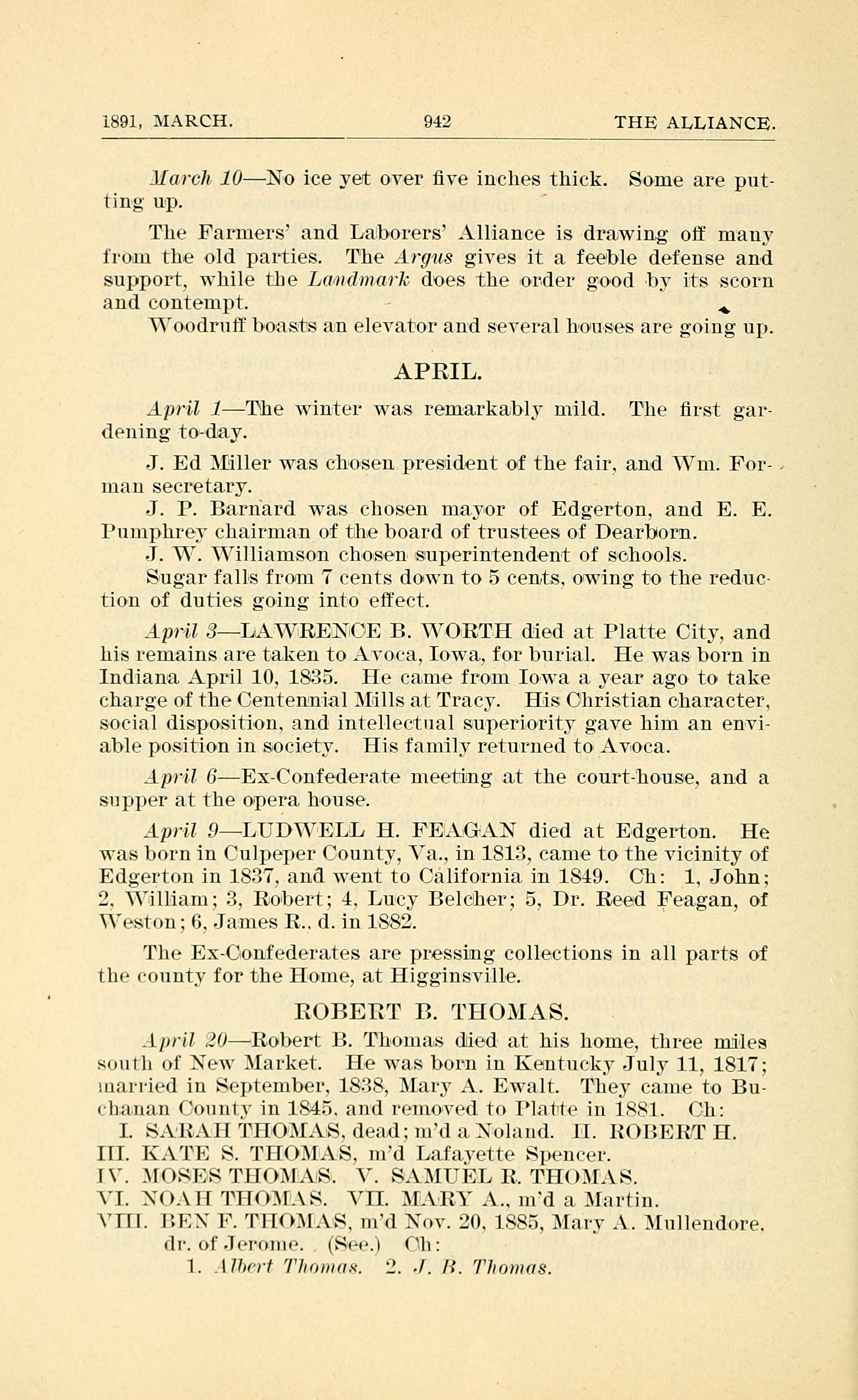 April 9 LUDWIELIL H. FEIAGAN died at Edgerton. He
