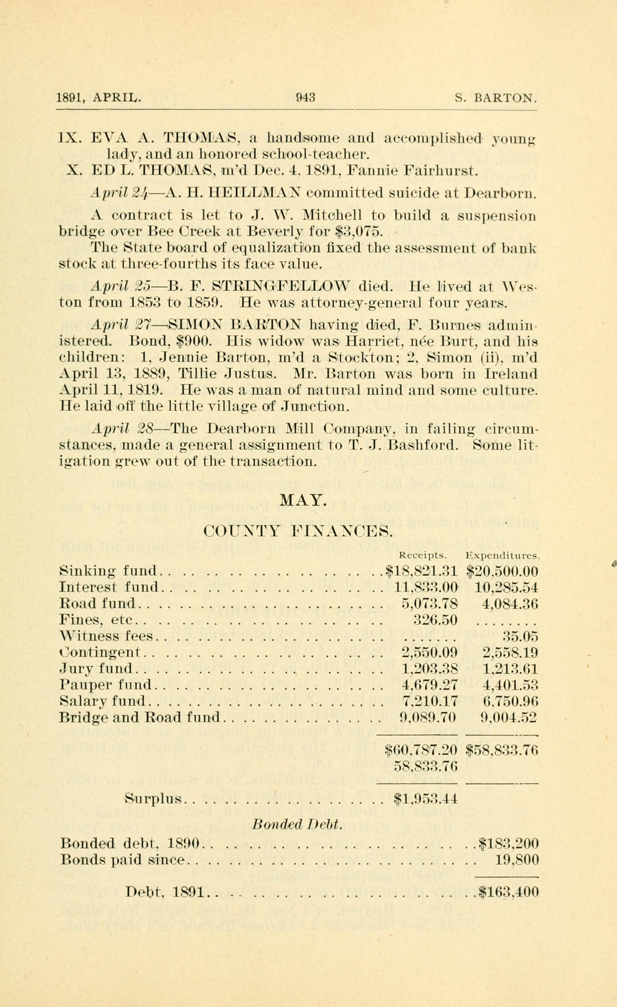 April 28 - The Dearborn Mill Company, in failing circumstances, made a general assignment to T. J. Bashford. Some litigation grew out of the transaction.