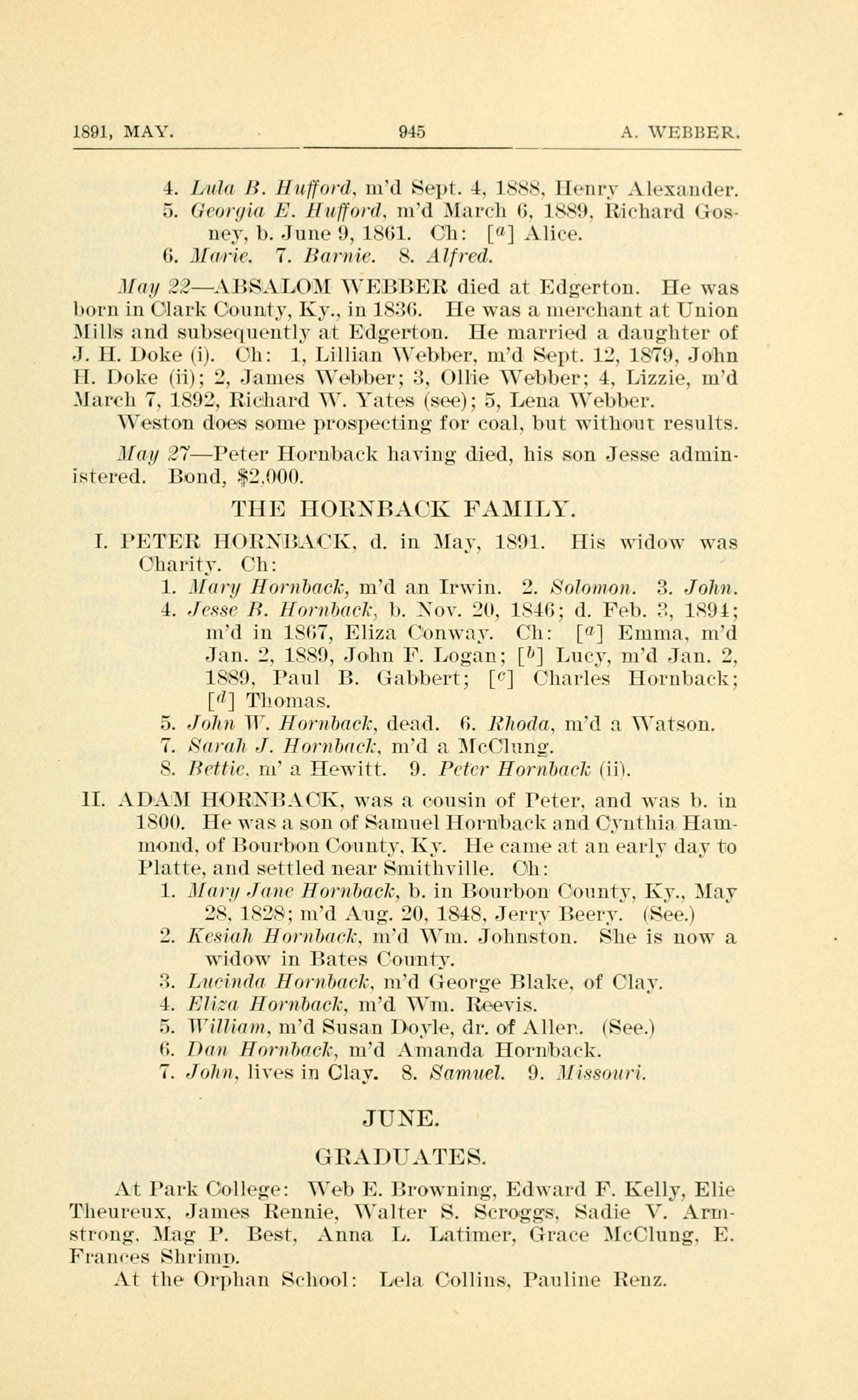 II. ADAM HORNBACK, was a cousin of Peter, and was b. in 1800. He was a son of Samuel Hornback and Cynthia Hammond, of Bourbon County, Ky. He came at an early day to Platte, and settled near Smithville. Children: