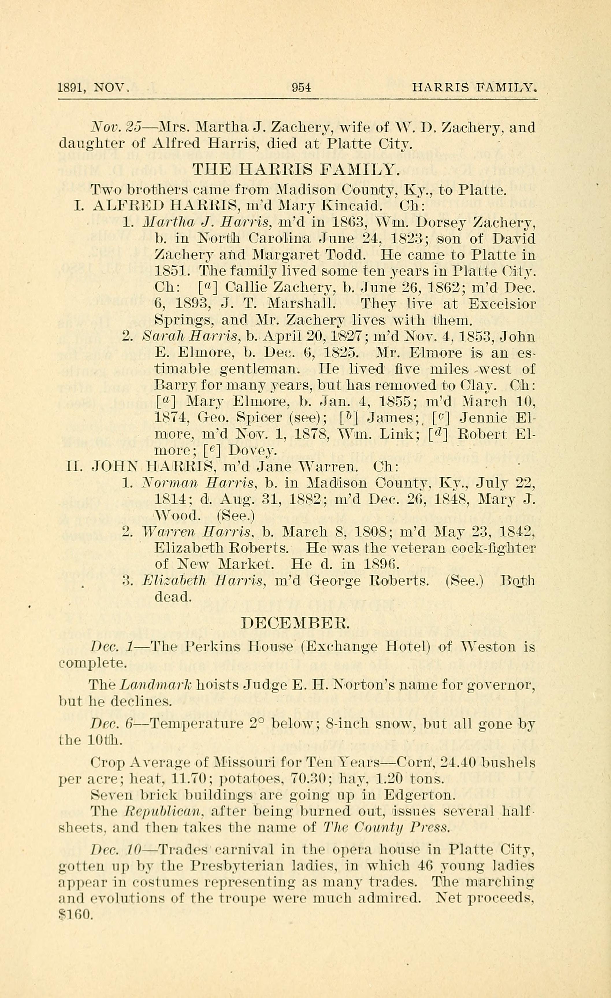 1. Martha J. Harris, married in 1863, William Dorsey Zachery, b. in North Carolina June 24, 1823; son of David Zachery and Margaret Todd. He came to Platte in 1851. The family lived some ten years in Platte City. Children: