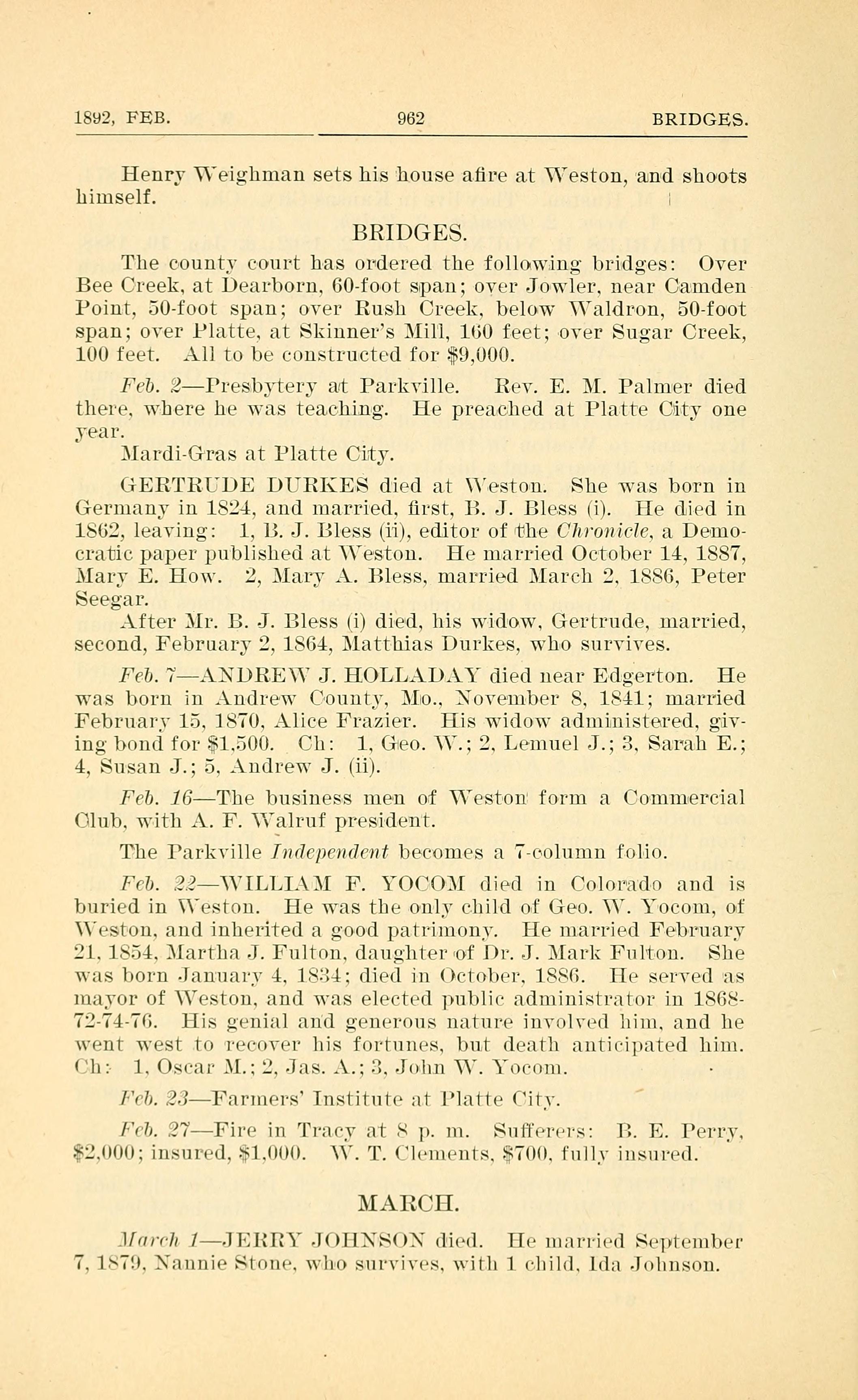 Feb. 7 - ANDREW J. HOLLADAY died near Edgerton. He was born in Andrew County, Mo., November 8, 1841; married February 15, 1870, Alice Frazier. His widow administered, giving bond for $1,500. Children: 1. George W. Holladay, 2. Lemuel J. Holladay, 3. Sarah E. Holladay, 4. Susan J. Holladay, 5. Andrew J. Holladay (ii).