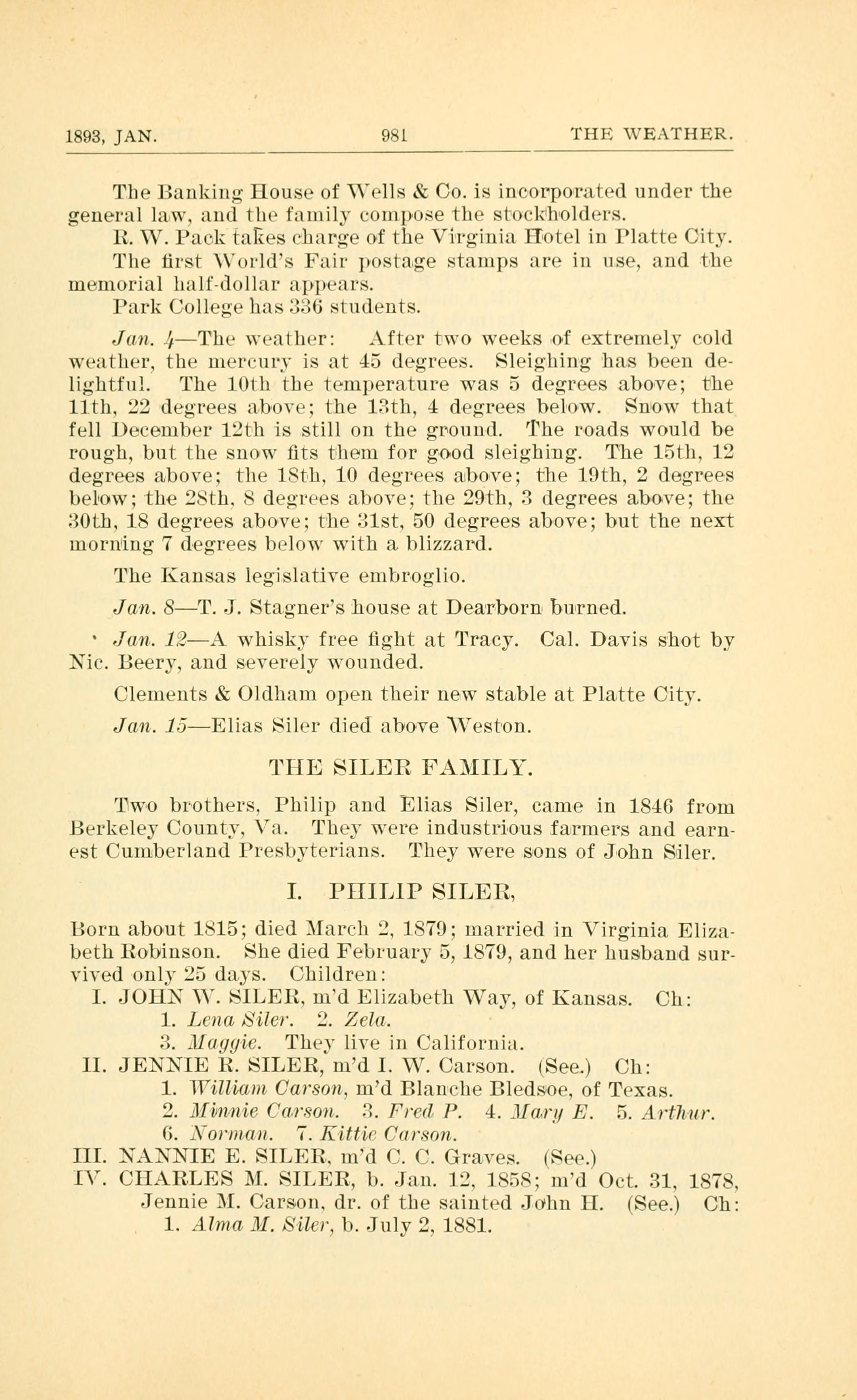 Jan. 15Elias Siler died above Weston.