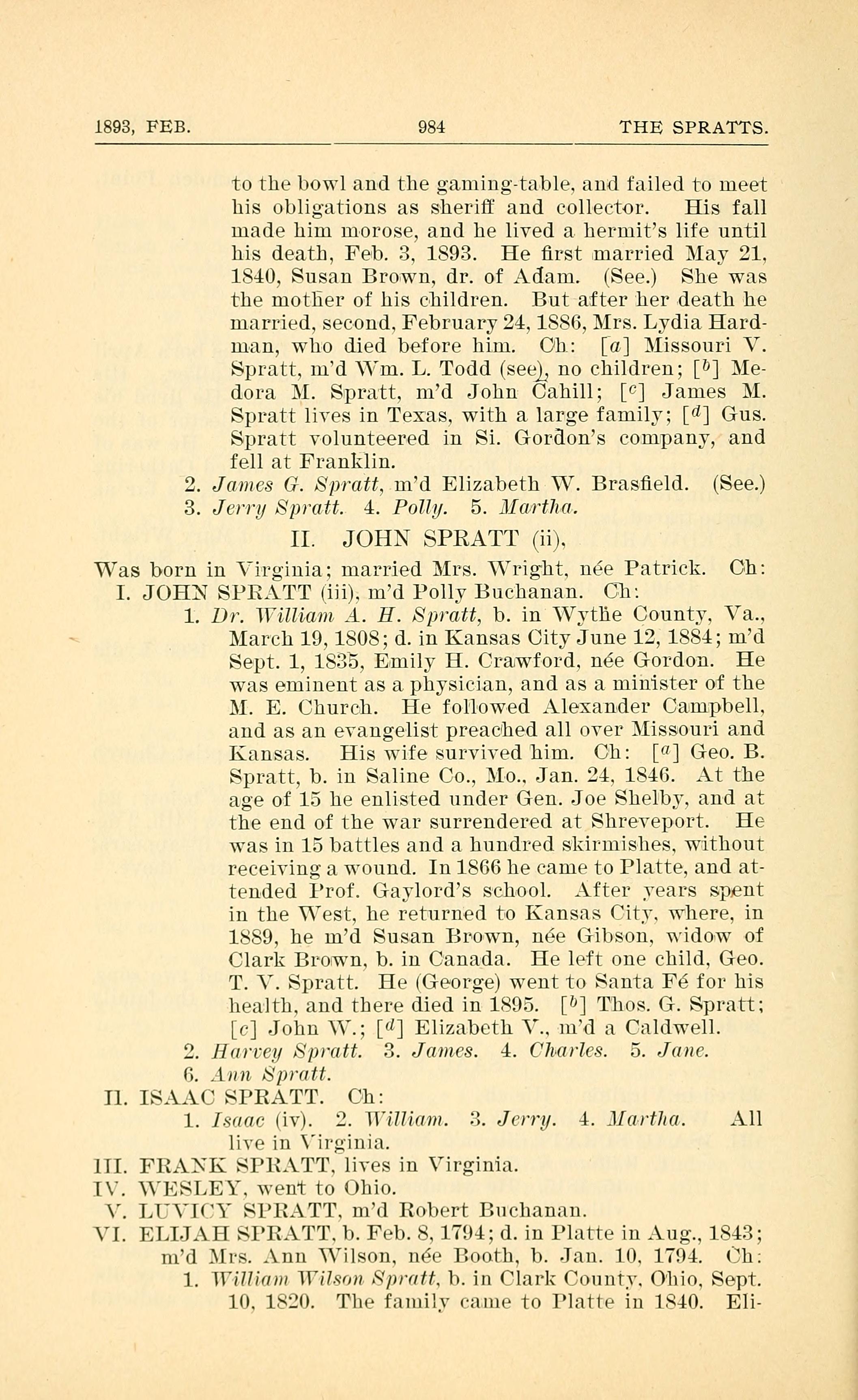 Spratt, b. in Saline C0,, Mo.. Jan. 24, 1846. At the