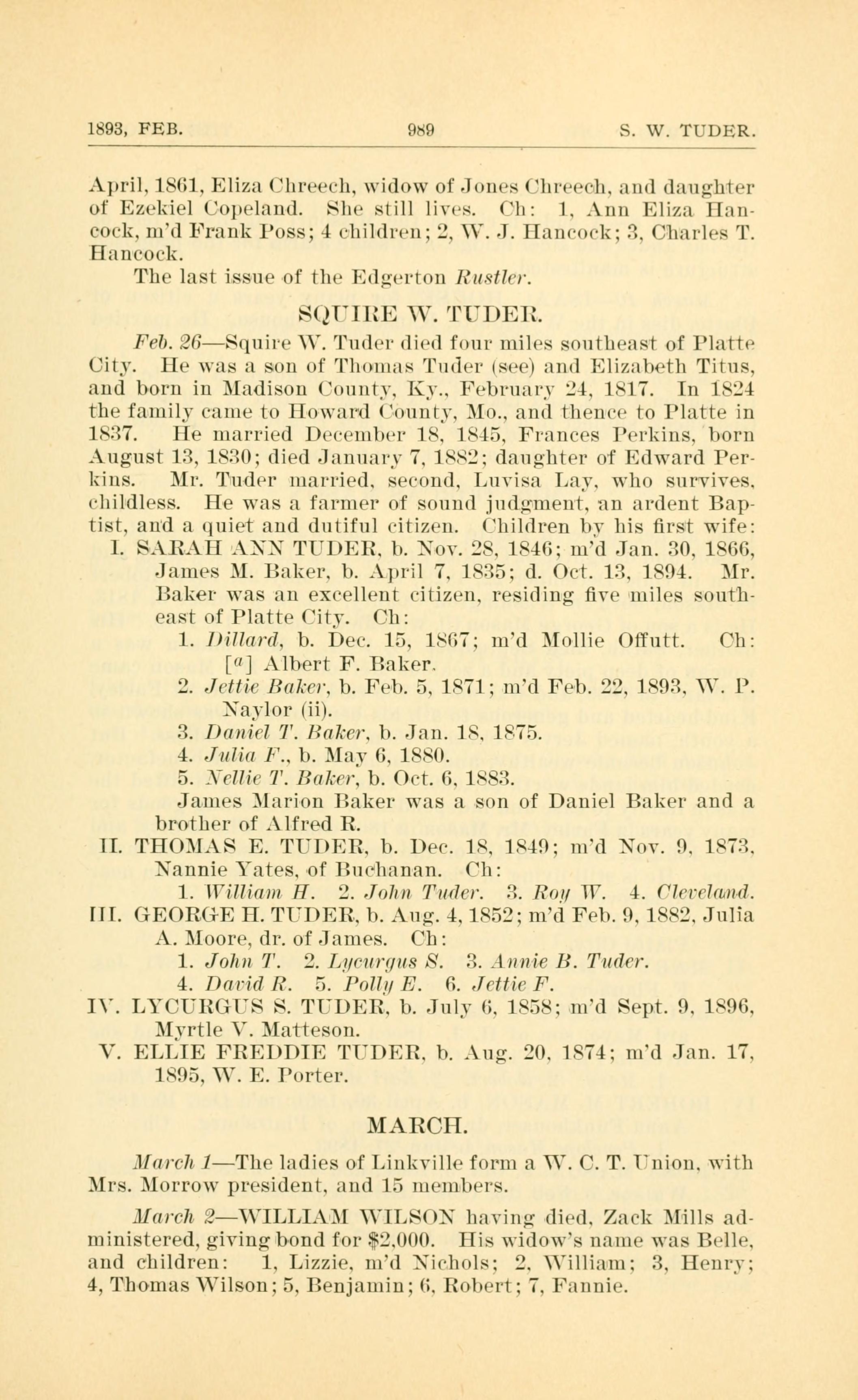 Feb. 26 - Squire W. Tuder died four miles southeast of Platte