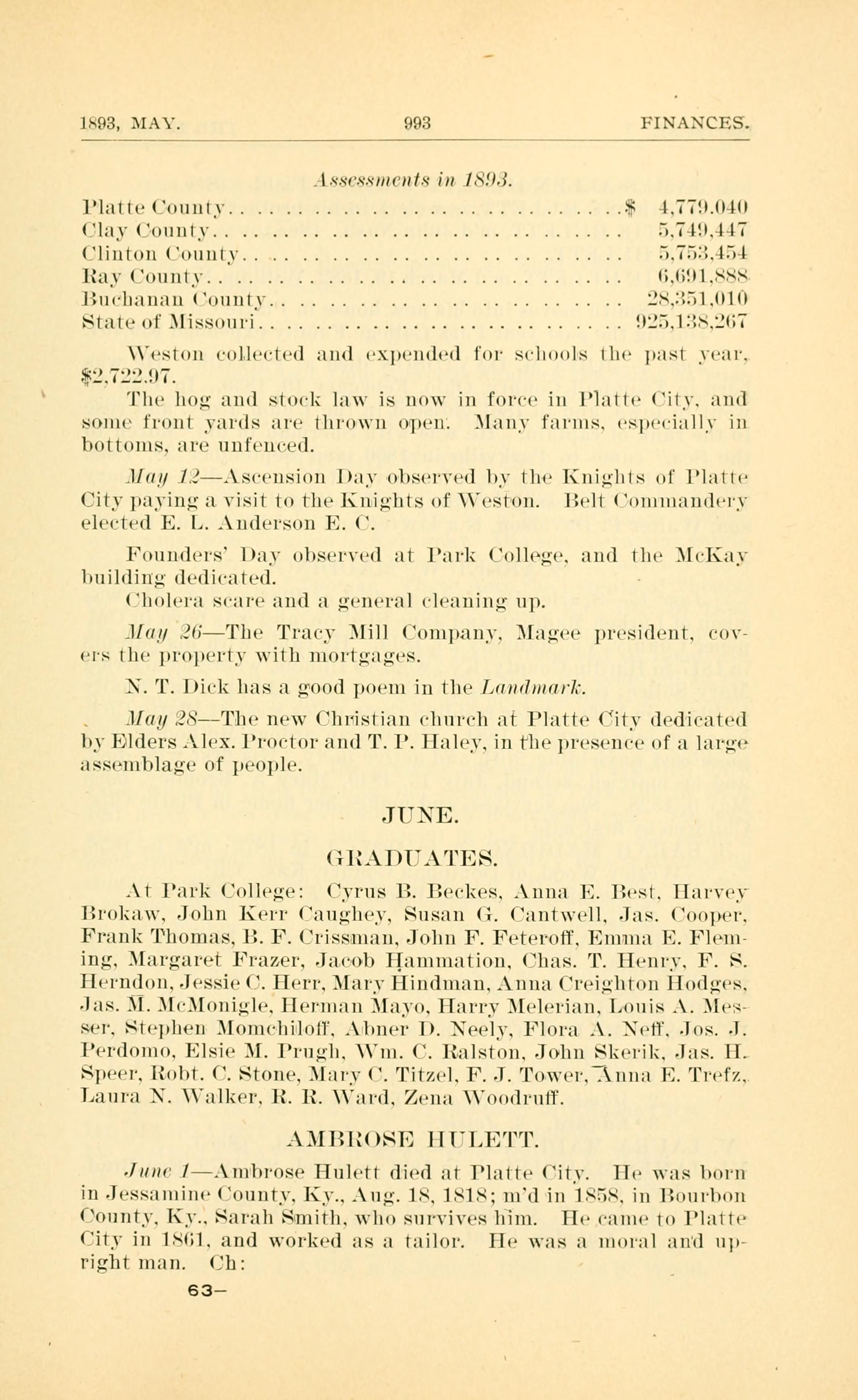 1893, MAY. 993 FINANCES. Assessments in 1893. JUNE GRADUATES AMROSE HULETT