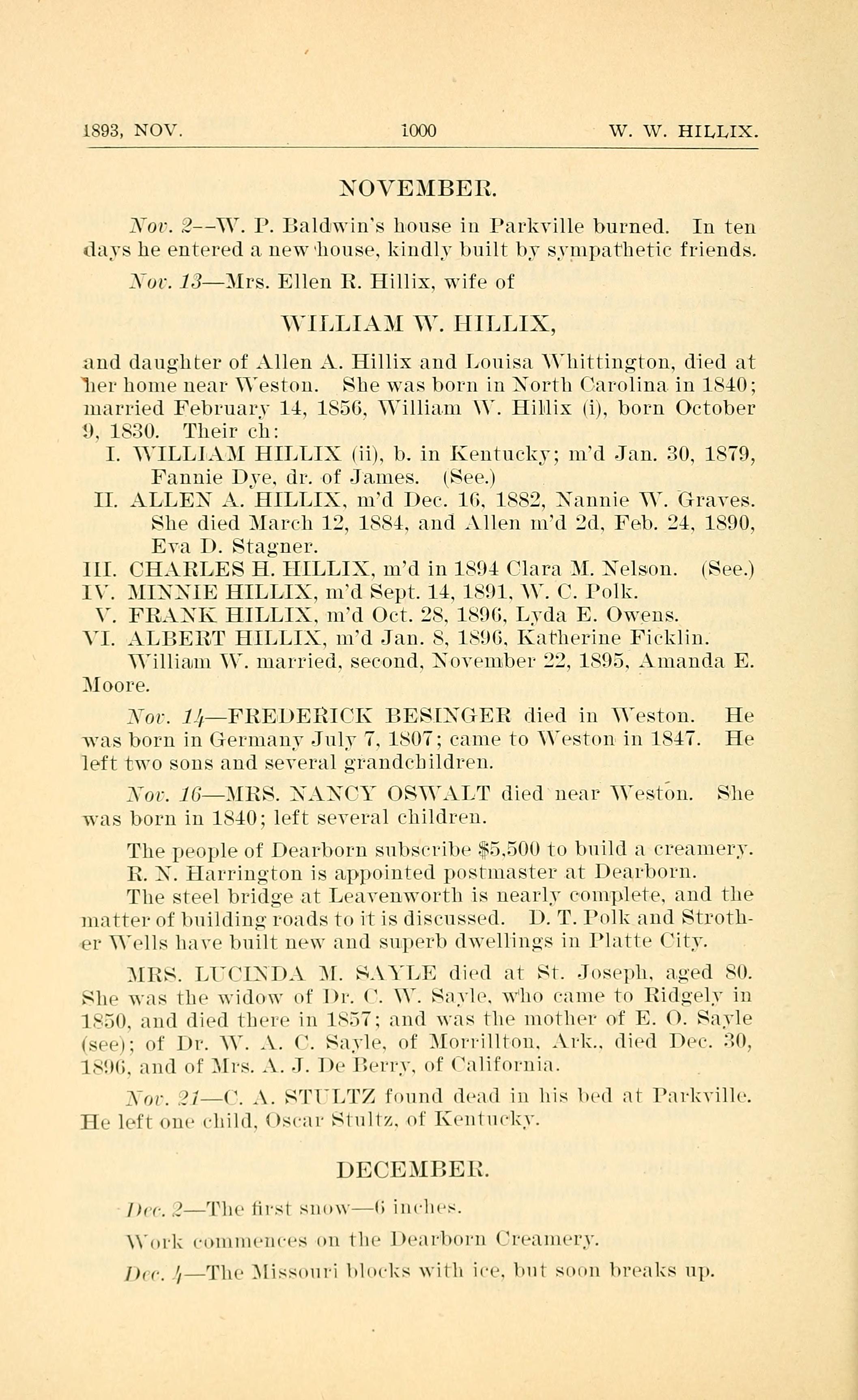 Nov. 2 - W. P. Baldwin's house in Parkville burned. In ten days he entered a new house, kindly built by sympathetic friends.