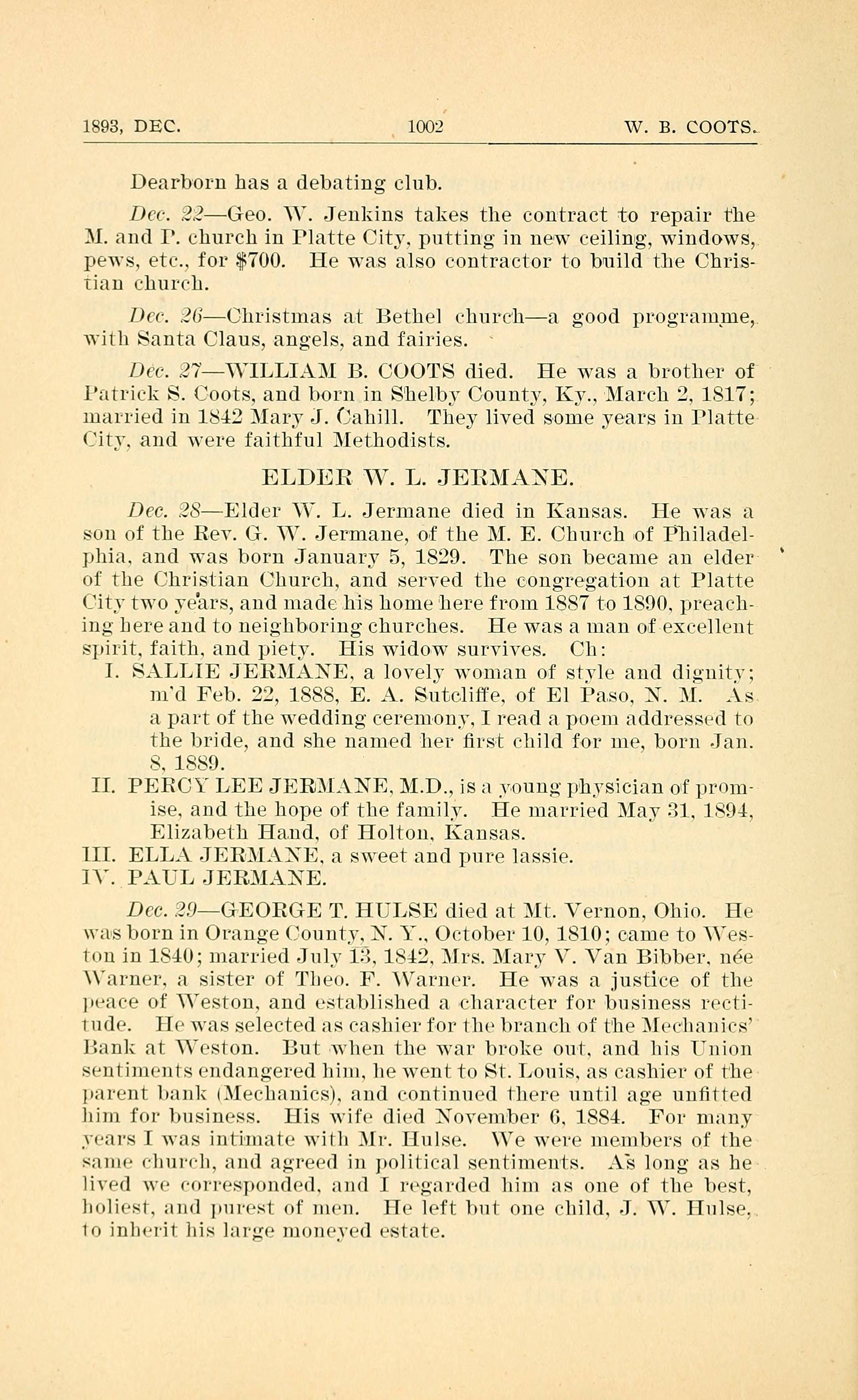 Dec 28 -Elder W. L. Jermane died in Kansas. He was a