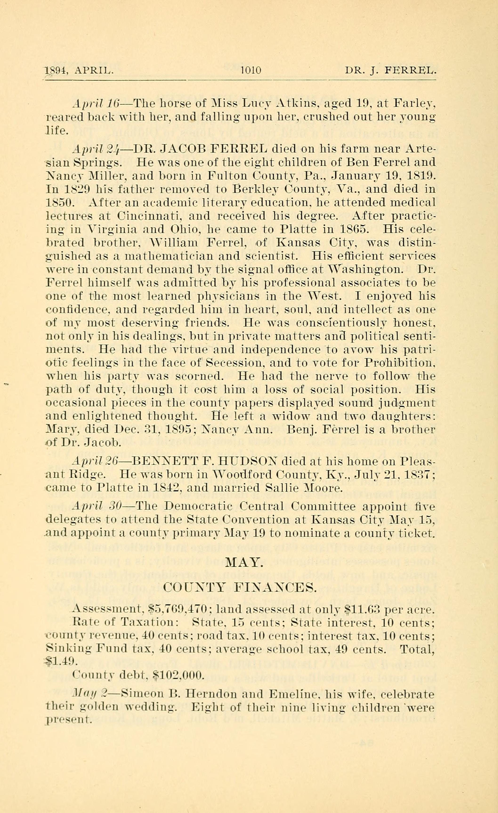 April 24 - JACOB FERREL died on his farm near Artesian Springs.