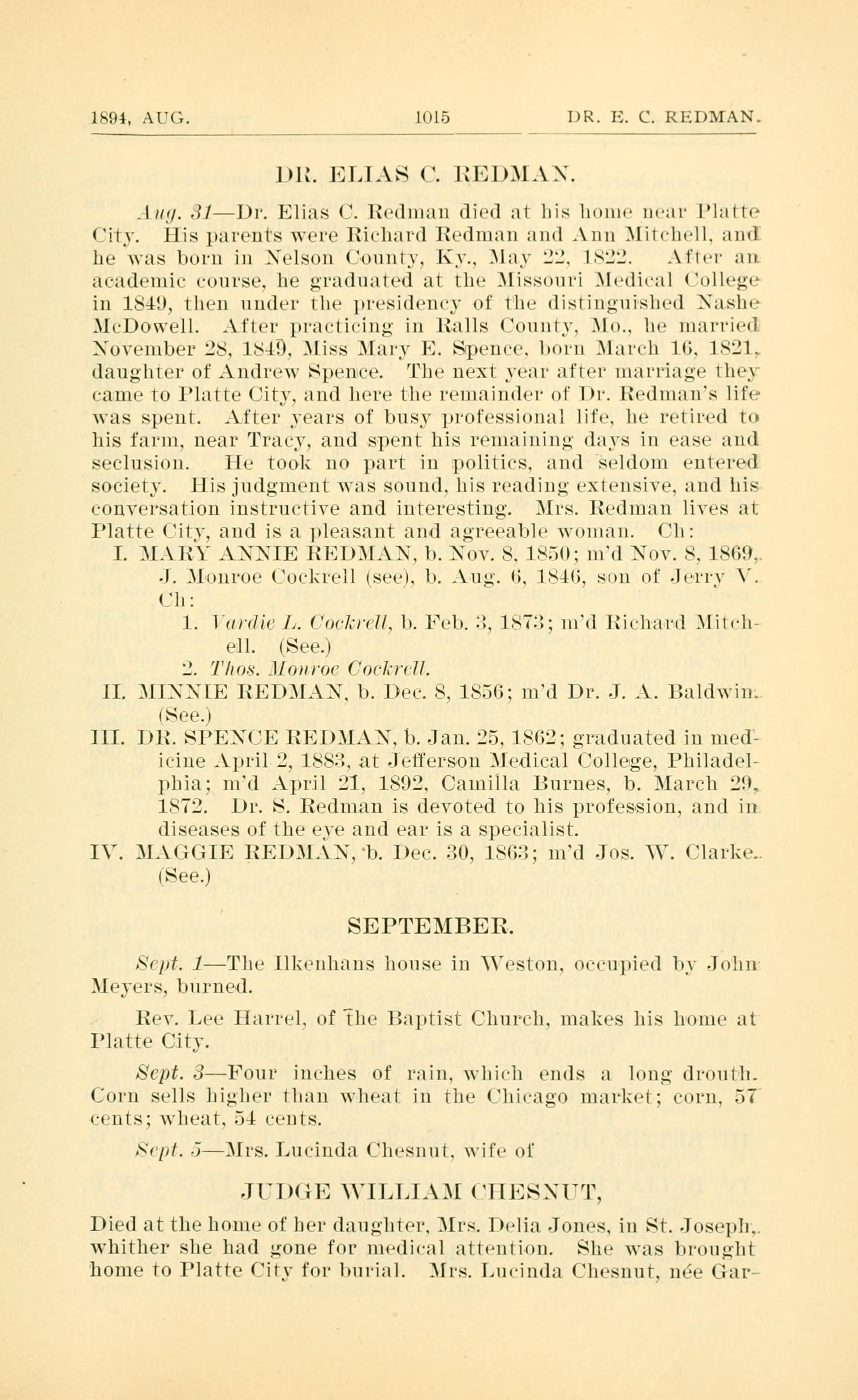 DR. ELIAS C. REDMAN died at his home near Platte City.