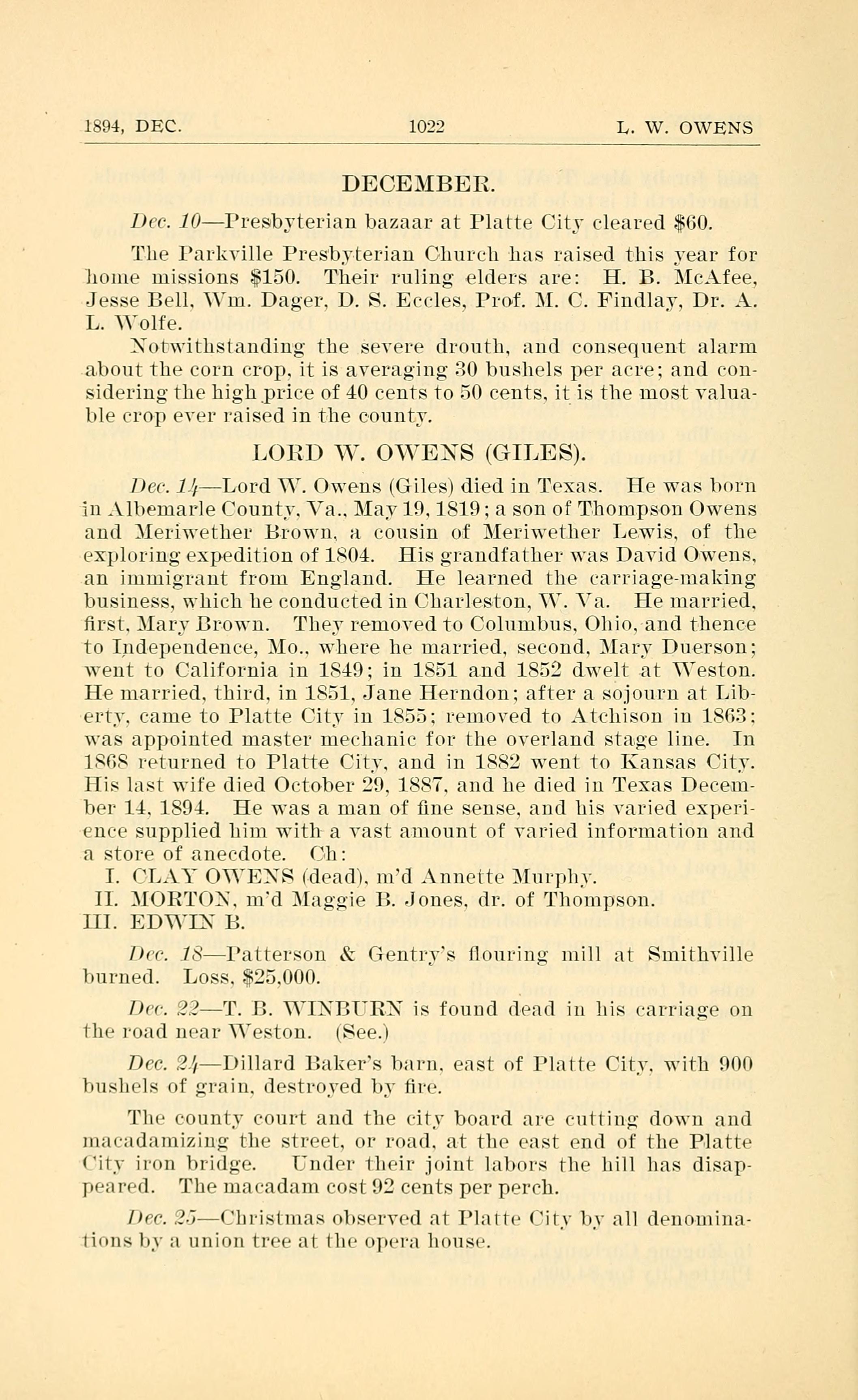 Dec. 1.} Lord W. Owens (Giles) died in Texas. He was born
