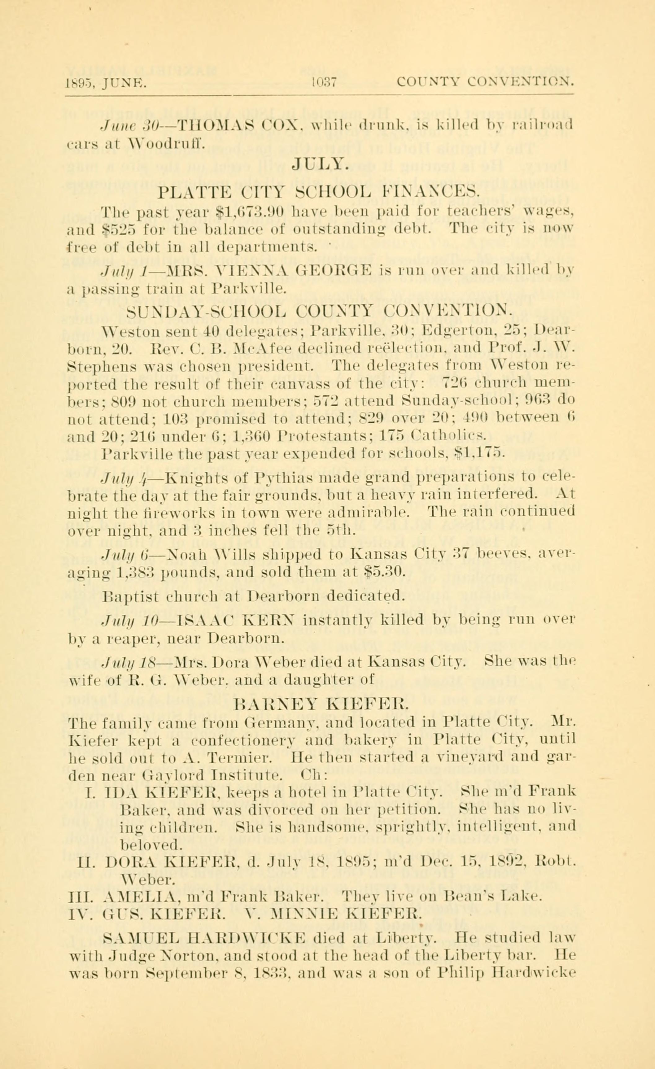 July 1 - MRS. VIENNA GEORGE is run over and killed by a passing train at Parkville.