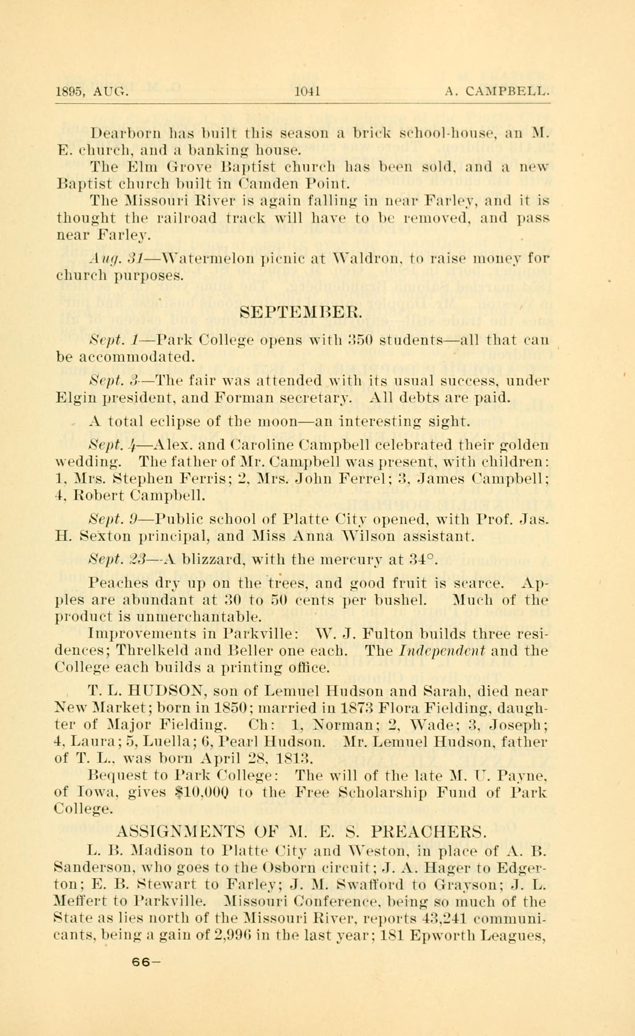 Sept. UPublic school of Platte Cit) opened. with Prof. Jas.