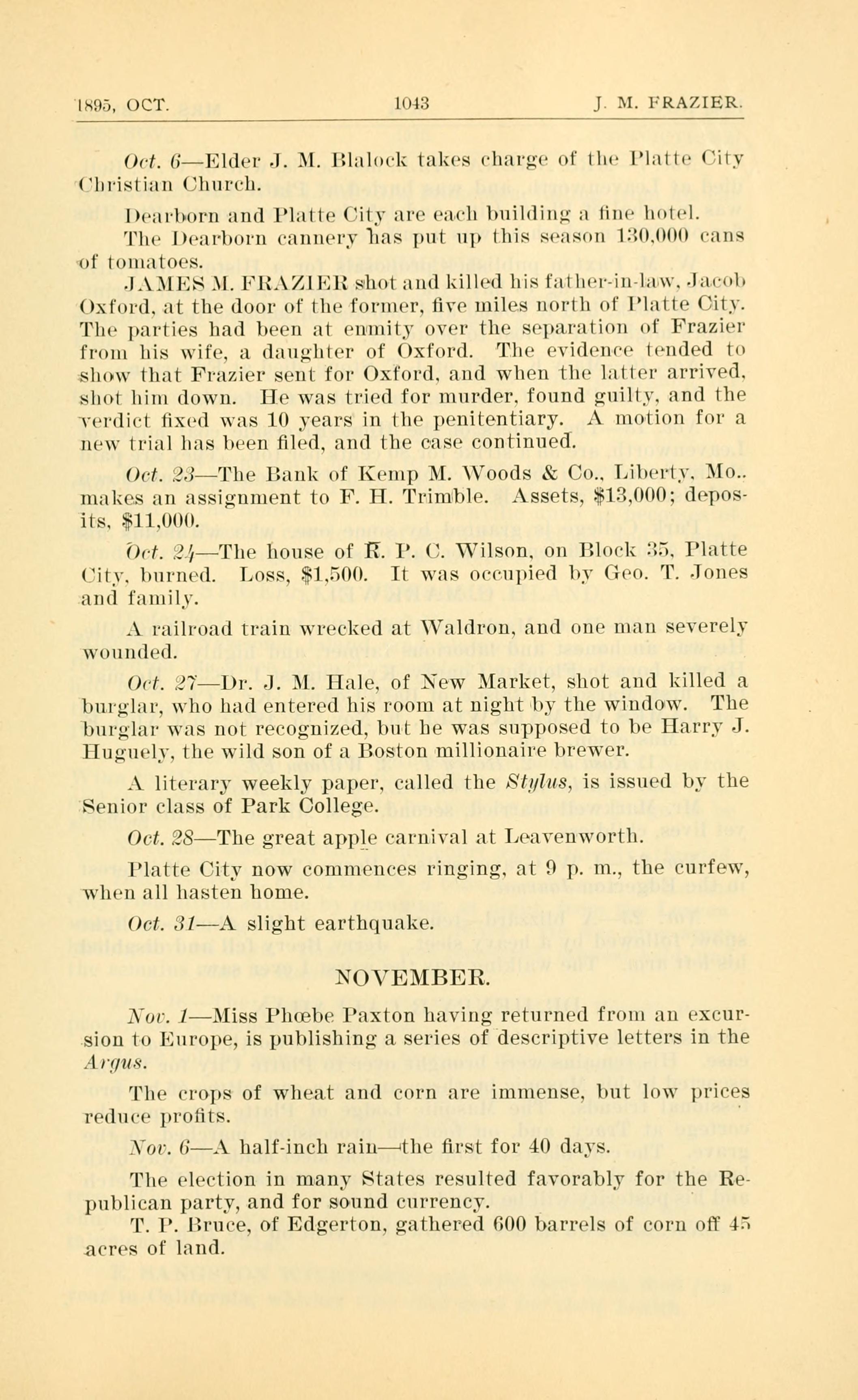 JAMES M. FRAZIER shot and killed his father-in-law. Jacob Oxford. at the door of the former, five miles north of Platte City.