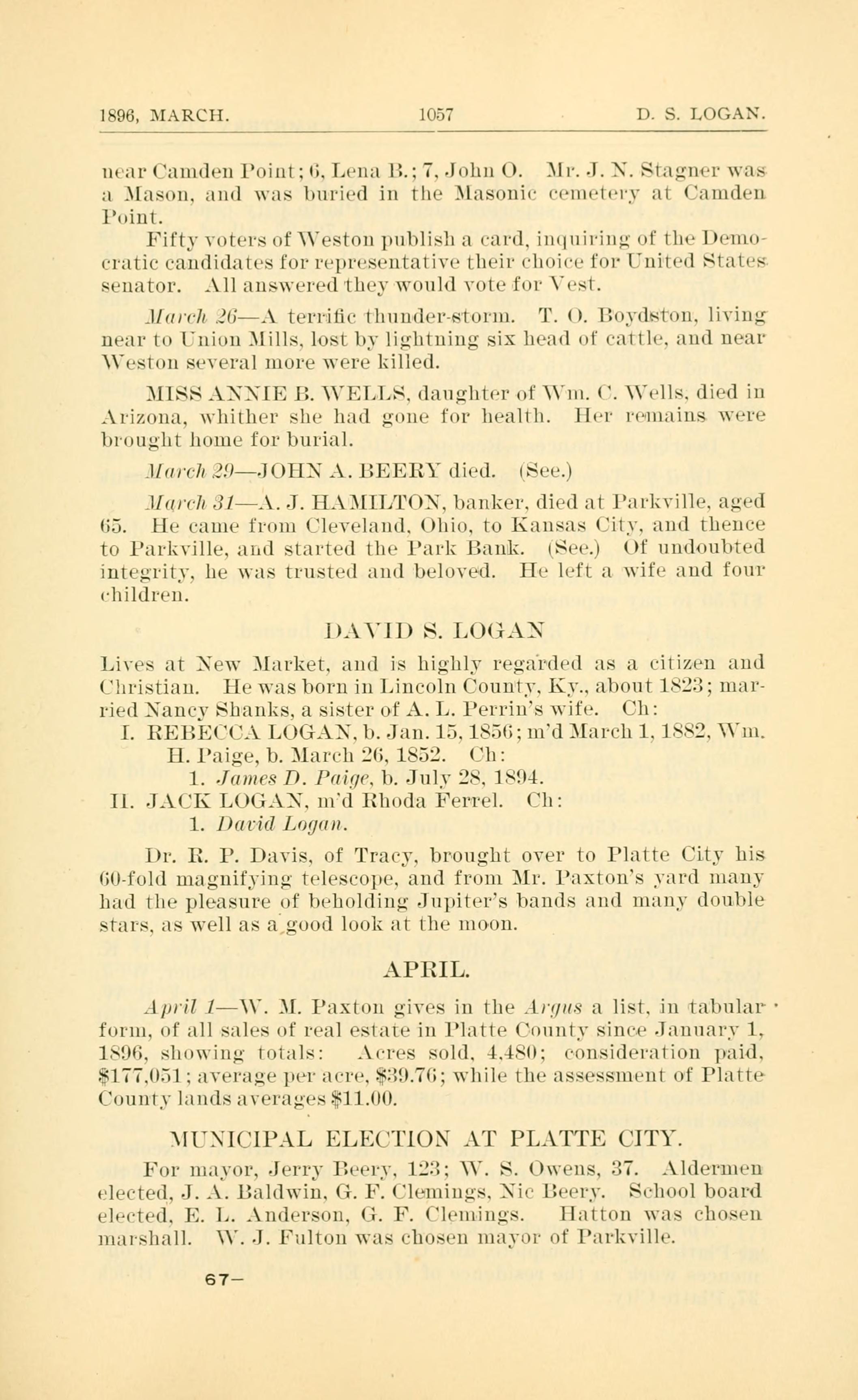 March 31 - A. J. HAMILTON, banker. died at Parkville, aged 65. He came from Cleveland, Ohio, to Kansas City, and thence to Parkville, and started the Park Bank. Of undoubted integrity, he was trusted and beloved. He left a wife and four children