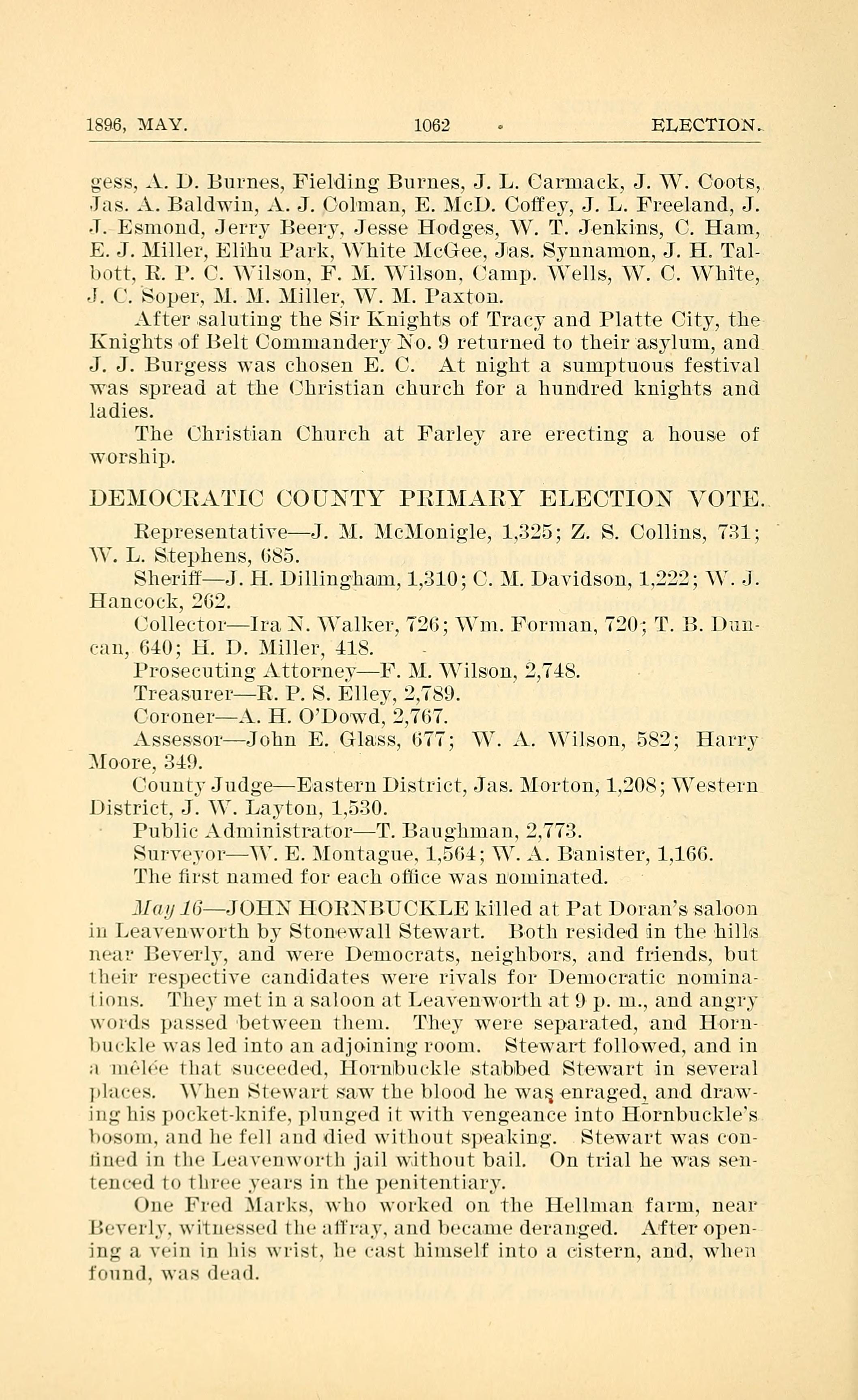 May 16 - JOHN HORNBUCKLE killed at Pat Doran's saloon in Leavenworth by Stonewall Stewart. Both reside in the hills near Beverly, and were Democrats, neighbors, and friends, but their respective candidates were rivals for Democratic nominations.