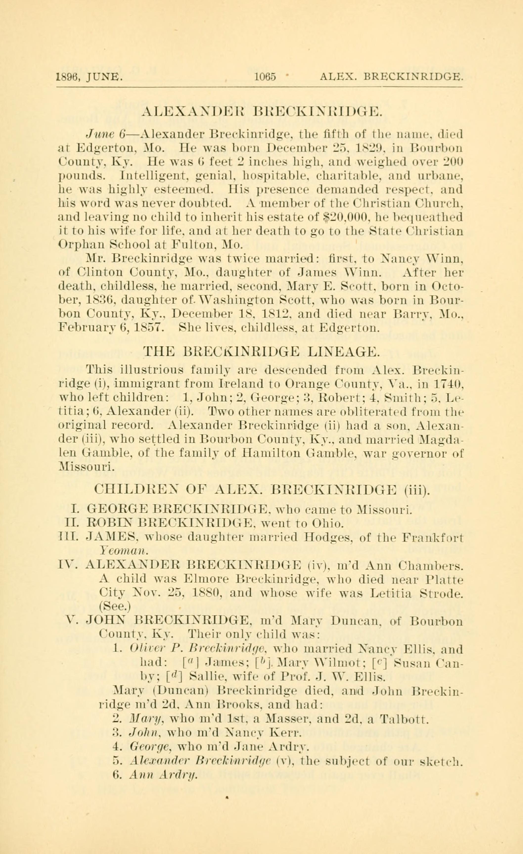 IV. ALEXANDER BRECKINRIDGE (iv), married Ann Chambers. A child was Elmore Breckinridge, who died near Platte City, Nov. 25, 1880, and whose wife was Letitia Strode.