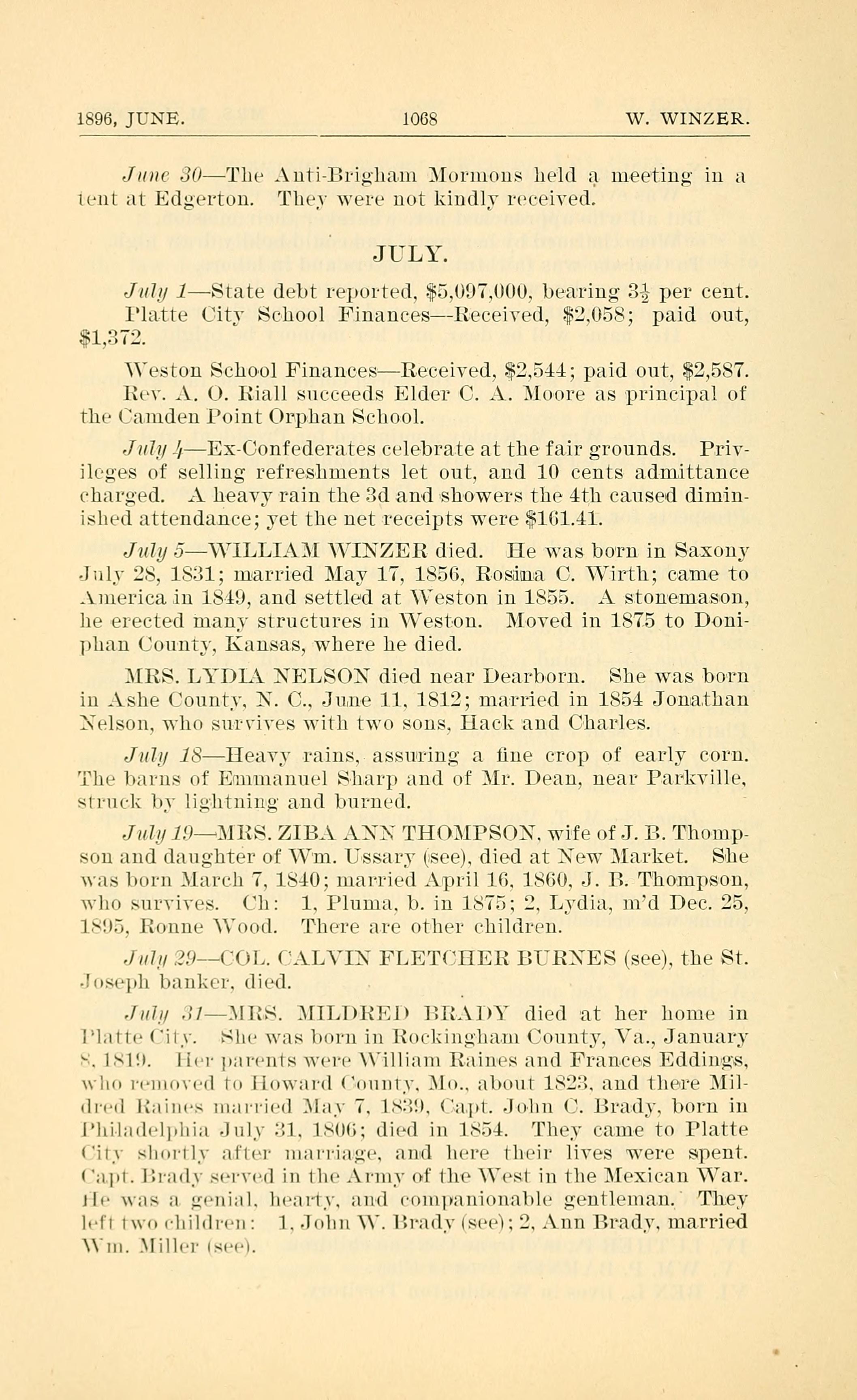 July 5 - WILLIAM WINZER died. He was born in Saxony July 28, 1831; married May 17, 1856, Rosina C. Wirth; came to America in 1849, and settled at Weston in 1855. A stonemason, he erected many structures in Weston. Moved in 1875to Doniphan County, Kansas, where he died.