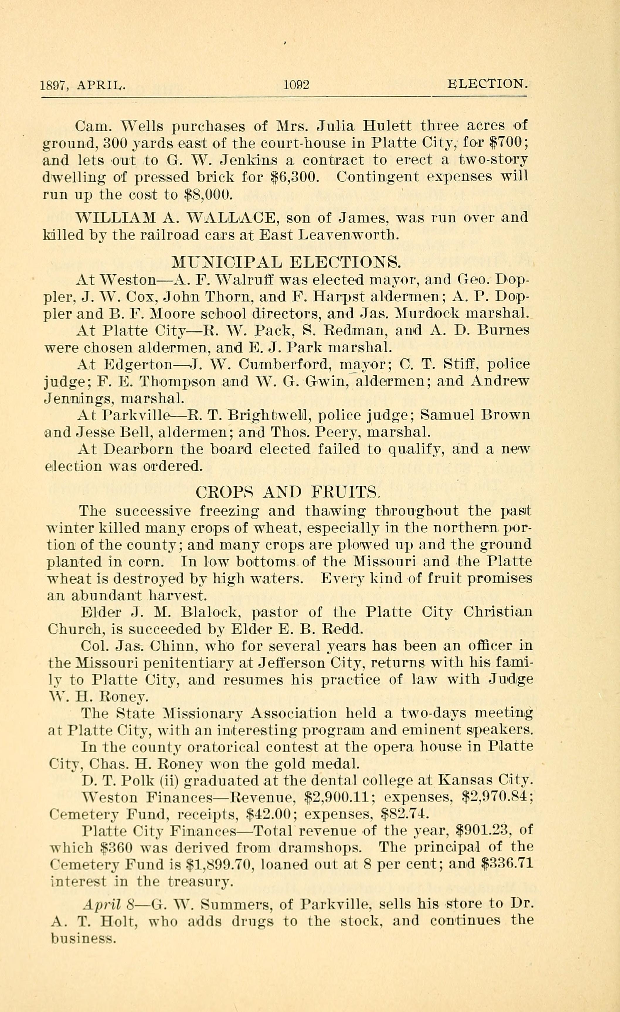 At Weston - A. F. Walruff was elected mayor, and Geo. Doppler, J. V. Cox, John Thorn, and F. Harpst alderrmen; A. P. Doppler and B. F. Moore school directors, and Jas. Murdock marshal.