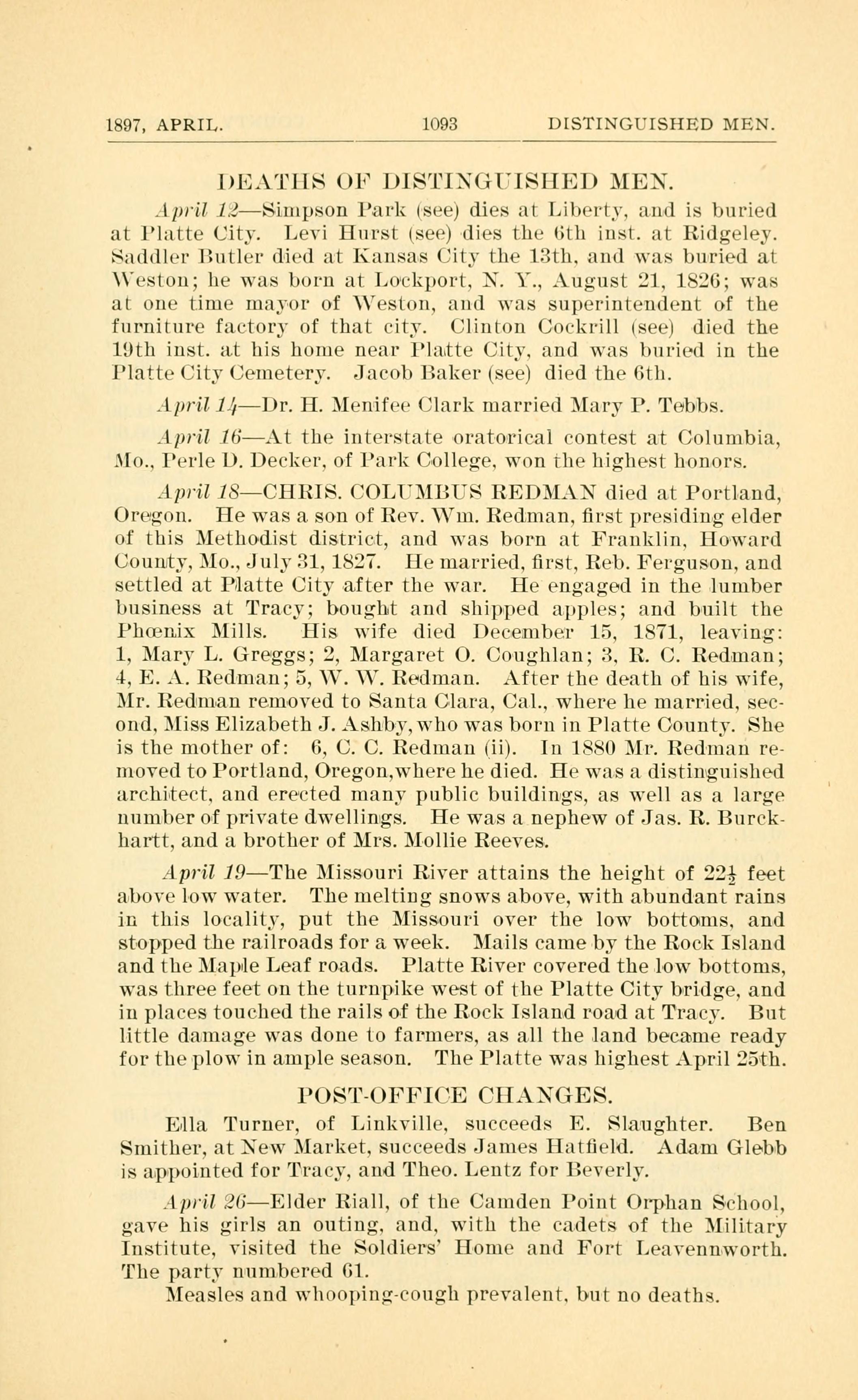 April 18~CHI{IS. COLIIMBUS REDMAN died at Portland,